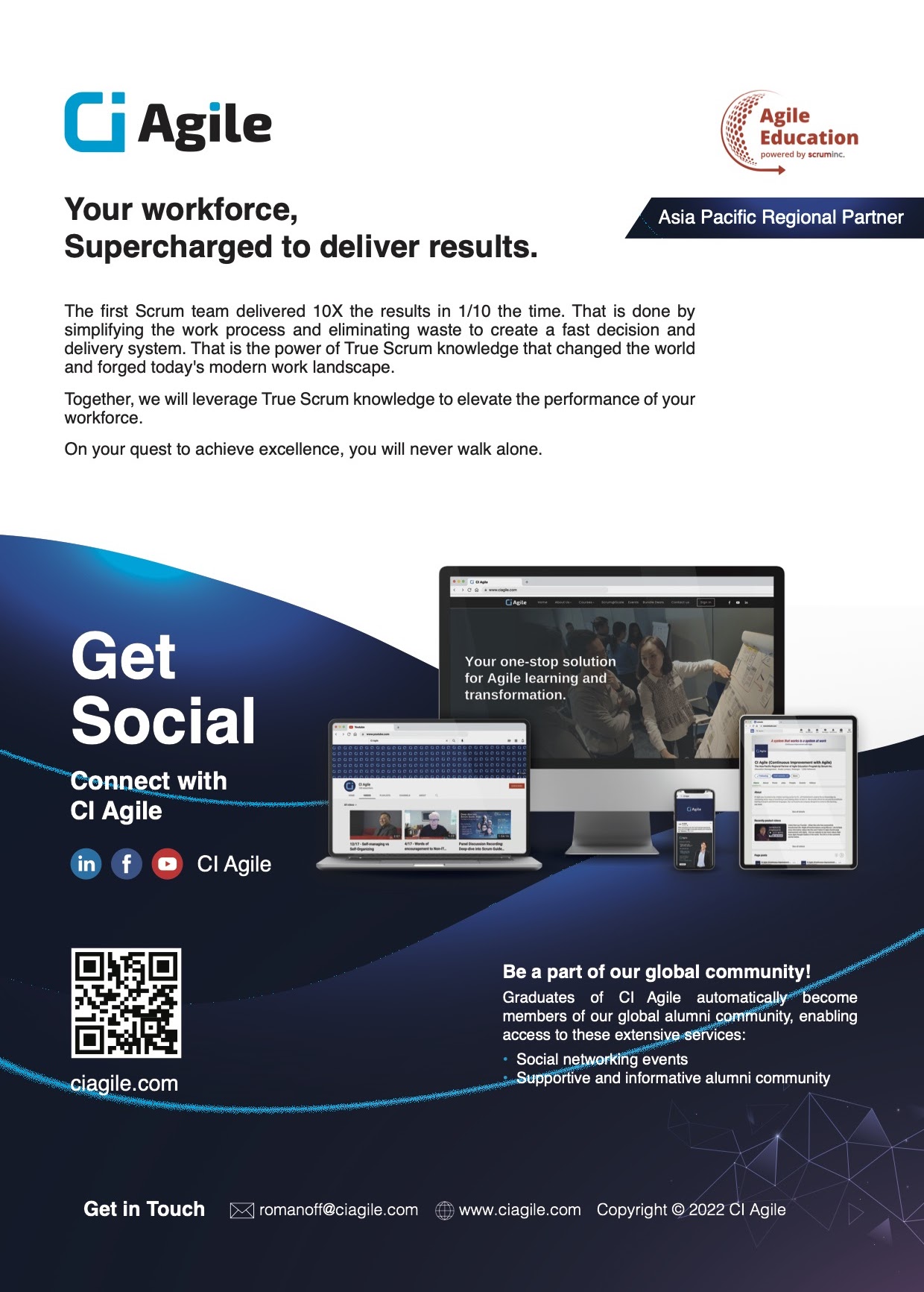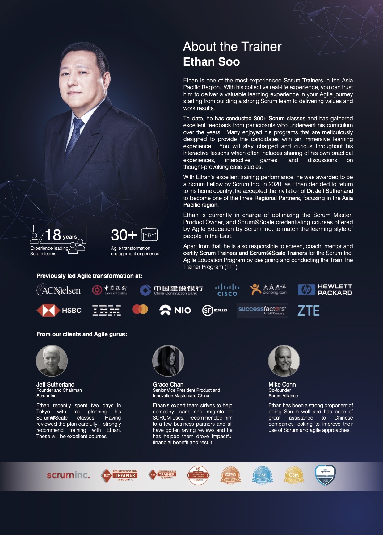 蘇老師 Ethan Soo 是 Registered Scrum Fellow、Registered Scrum@Scale 和 Scrum 培訓師,也是亞太地區頂尖的 Scrum 培訓師之一。