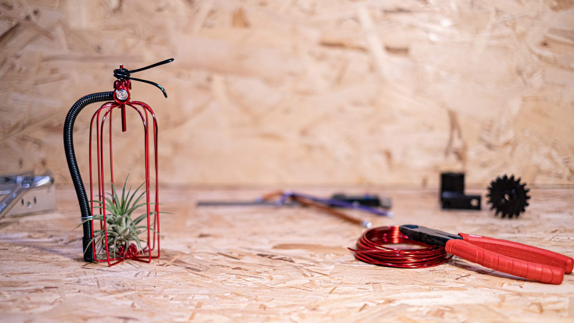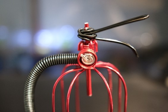 利用桌上型彎管機製造出彎管藝品的部分零件(B:瓶身),並由藝術家教導學員如何用鋁線結合各部位零件(A.握把&壓力表 B.瓶身&空氣鳳梨 C.噴嘴),創作出富有消防意識與美感的紀念藝術品