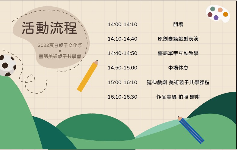 - 本次活動,包含臺語原創戲劇表演,以及美術課程,建議年齡2~6歲孩童參加,如超過該範圍之年紀,請家長斟酌報名。