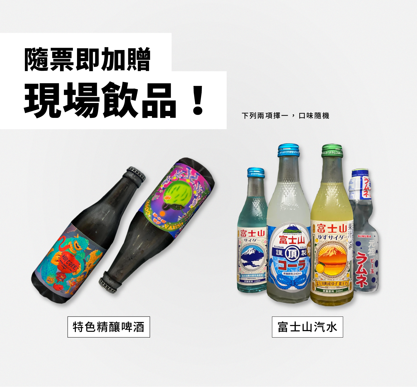 票券為電子票券,隨票加贈現場飲品【特色精釀啤酒(口味隨機)】、【富士山汽水(口味隨機)】兩項擇一,請於報名表單勾選,數量有限,贈完為止。
