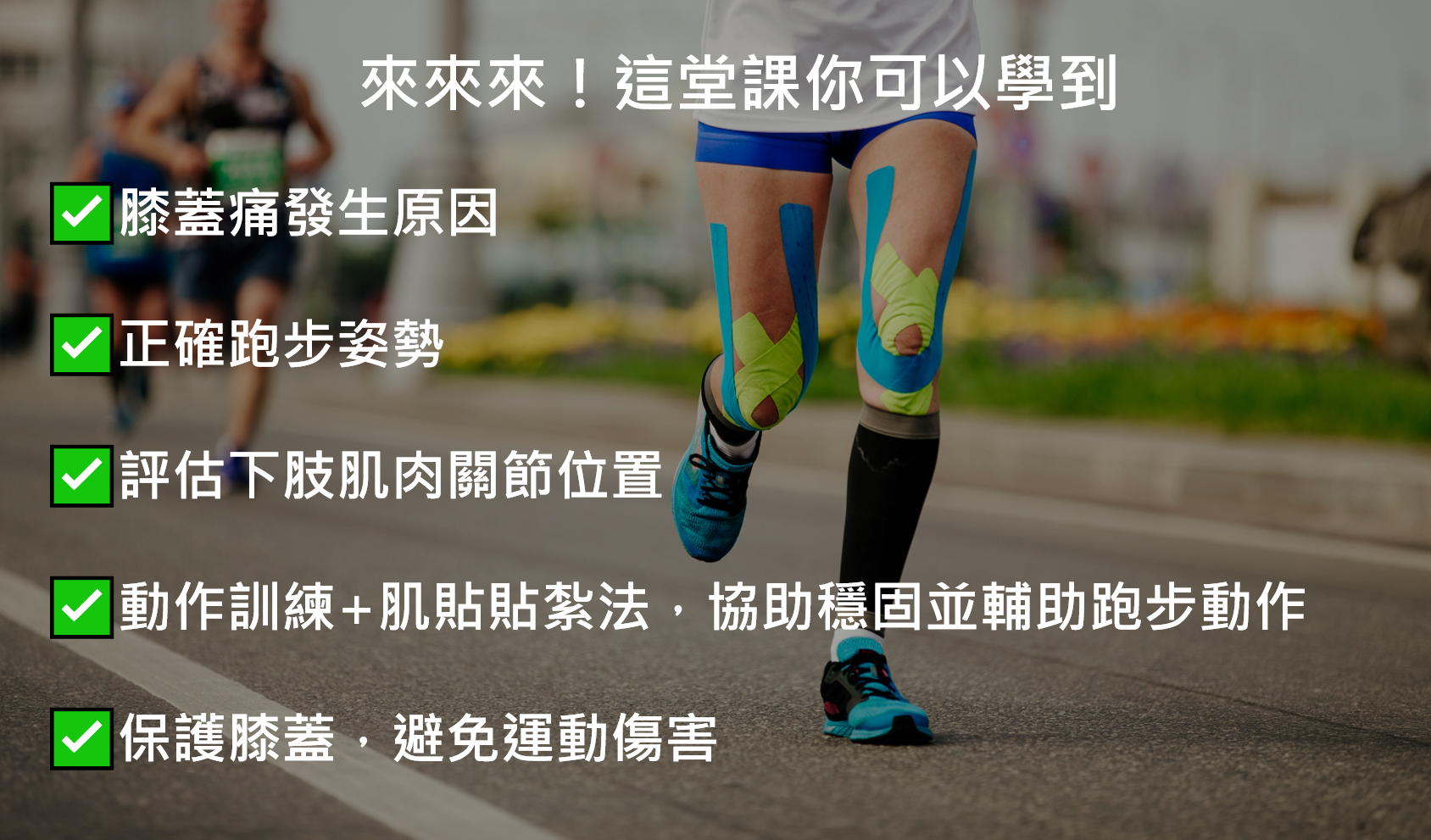 ✨上完課你能學會:了解膝蓋痛原因、學習正確跑步姿勢、訓練肌肉關節位於正確位置、使用肌貼進行貼紮