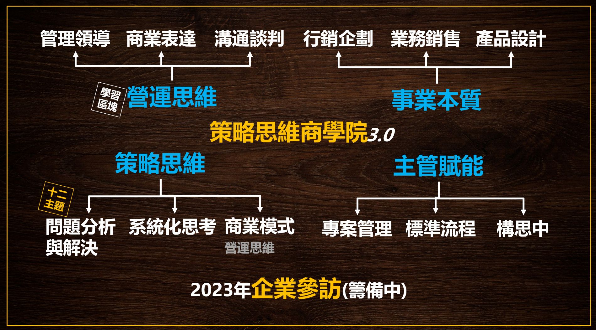 這次的說明會就是會跟大家說明策略思維商學院明年的課程規劃,而相較於2022年的課程,在2023年策略思維商學院3.0我們會有三大核心教學區塊︰事業本質、營運思維與策略思維這三塊教學主軸之外,我們移除了個人職涯這部分,更專注在協助中小企業,增加了一塊主管賦能的教學區塊,我們在這邊試著讓主管成為企業主更強大實用的火力,我們將會規畫一系列中小企業主管需要核心技能課,來構成我們2023年策略思維商學院一整年的學習計畫。