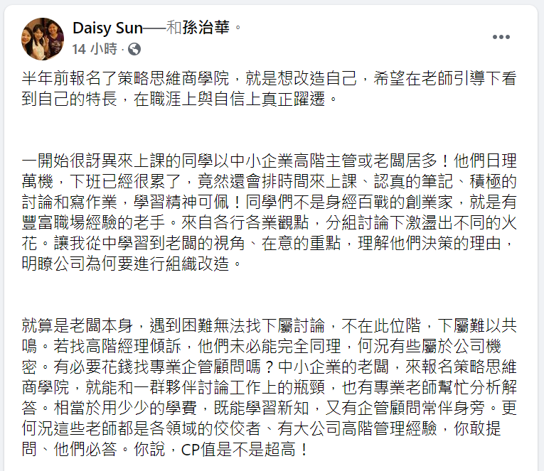 因為和你一起學習的人都會是一家企業企業主與主管,