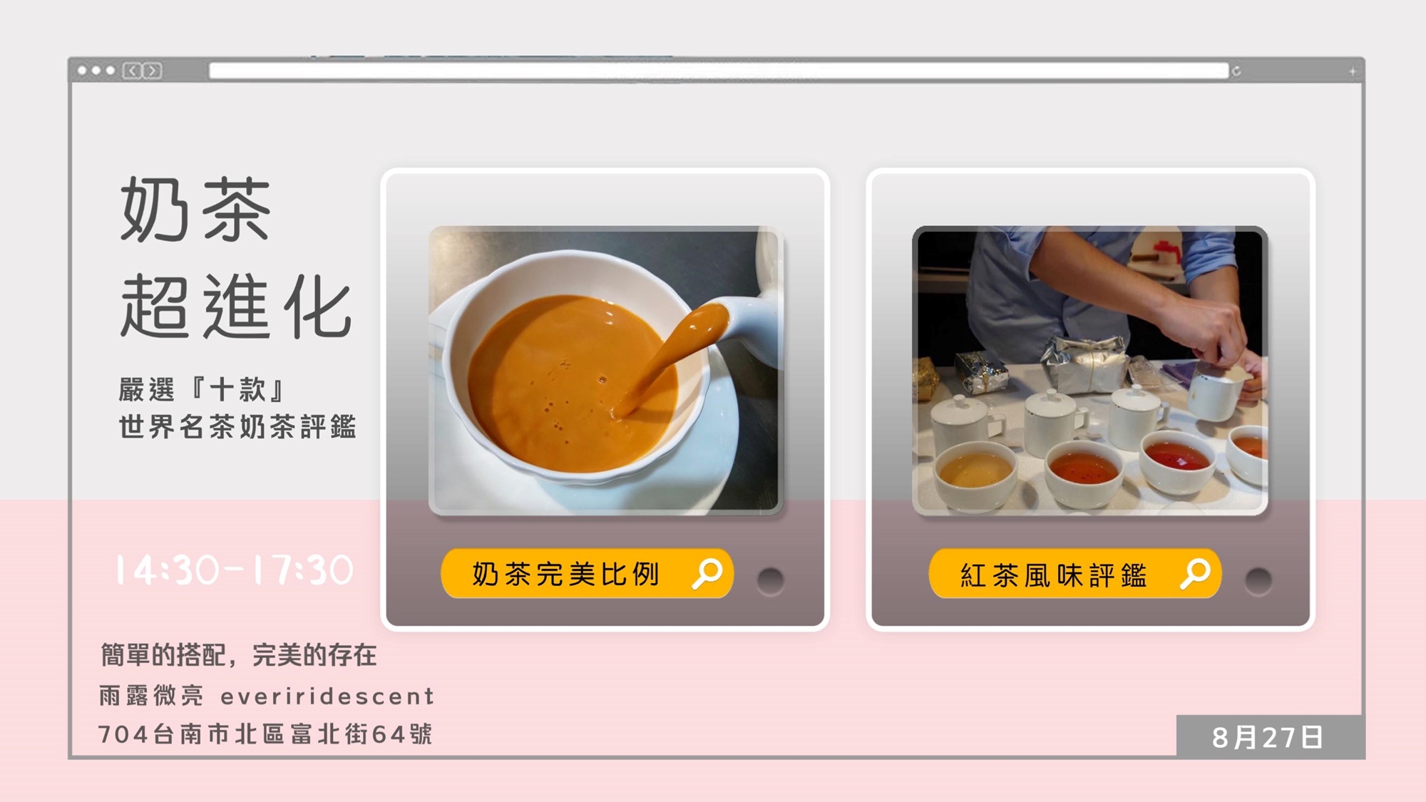 在這場三小時的『實作品味課程』中,老師將透過活潑生動的方式進行奶茶基礎知識介紹、器具挑選、茶款、牛奶分類說明,也講一講茶與奶的組合技巧與香氣記憶;更藉著品飲活動,讓你拓展視覺、嗅覺、味覺的黃金體驗,讓你更了解自己對於鍋煮奶茶味道的偏好。