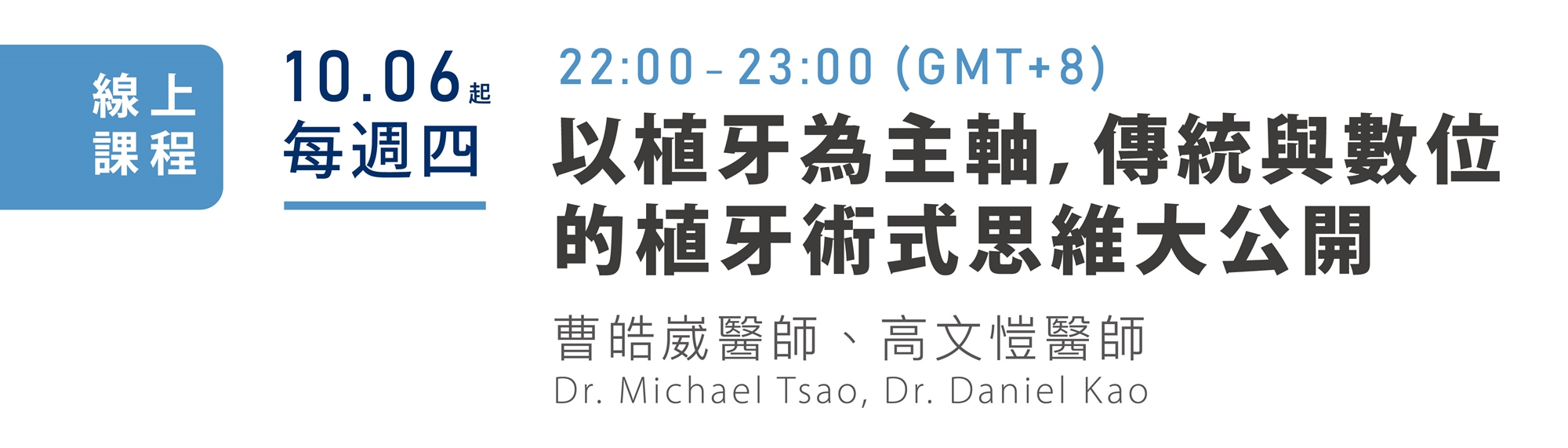 | 10/20 (四) | Chapter III 傳統植牙如何省下數位科技的費用 - 傳統植牙真的過時了嗎?進入數位植牙前,你是否熟悉微創手術? | 高文愷 |