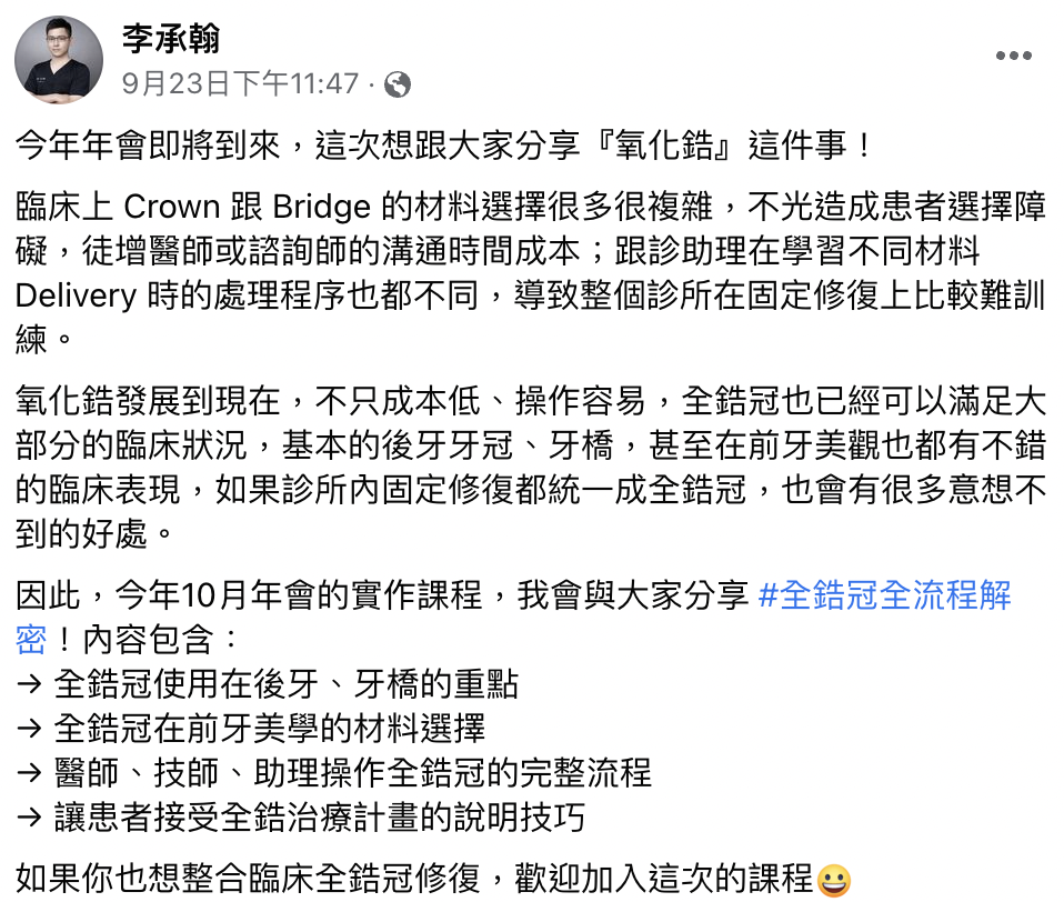 | Lecture | 全鋯經濟學: 當代氧化鋯概論、適應症選擇 | 李承翰 |