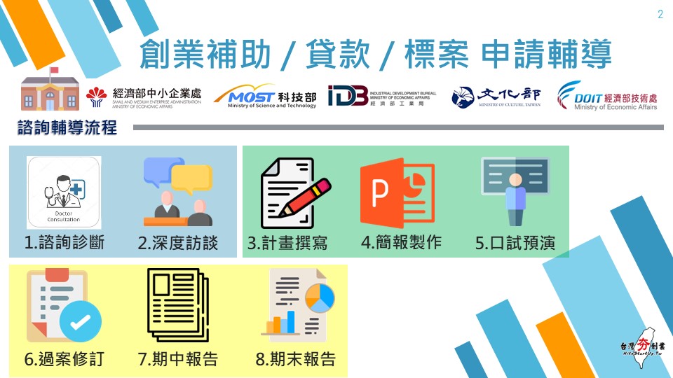 2. 新創及中小企業政府補助、創業補助申請:包含SBIR、SIIR、台北市政府創業獎勵補助、行政院國發基金-創業天使計畫、科技部創新創業激勵計畫、創新科技應用與服務計畫等。