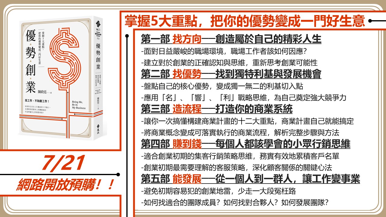 《優勢創業:掌握5大重點,把你的優勢變成一門好生意》一書,匯集了他輔導與授課的實務經驗,無論是中年失業或有轉職需求,無論你想斜槓或創業,或是害怕被趨勢淘汰而想提前布局,透過書中五大實戰法則與各種有效的工具表單,教你找出自己的獨特優勢,創造理想的人生事業。