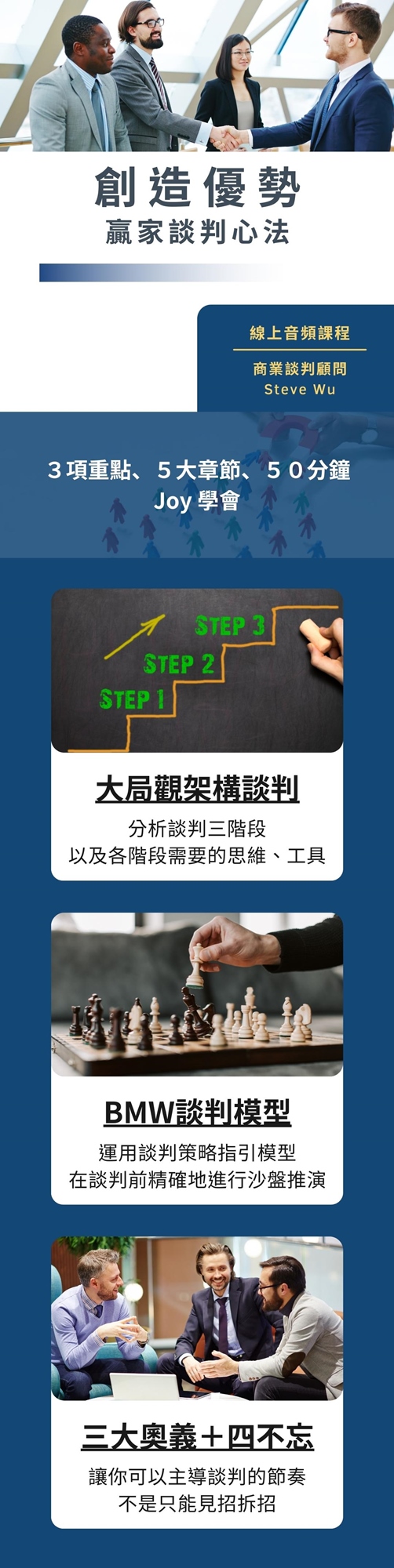 我是Steve,參與並主導過多年的談判,經歷過各式各樣對手,有處過優勢、也身陷過劣勢。但無論如何,我總是能在最後創造出雙贏或多贏的結果,鮮少以破局收場。