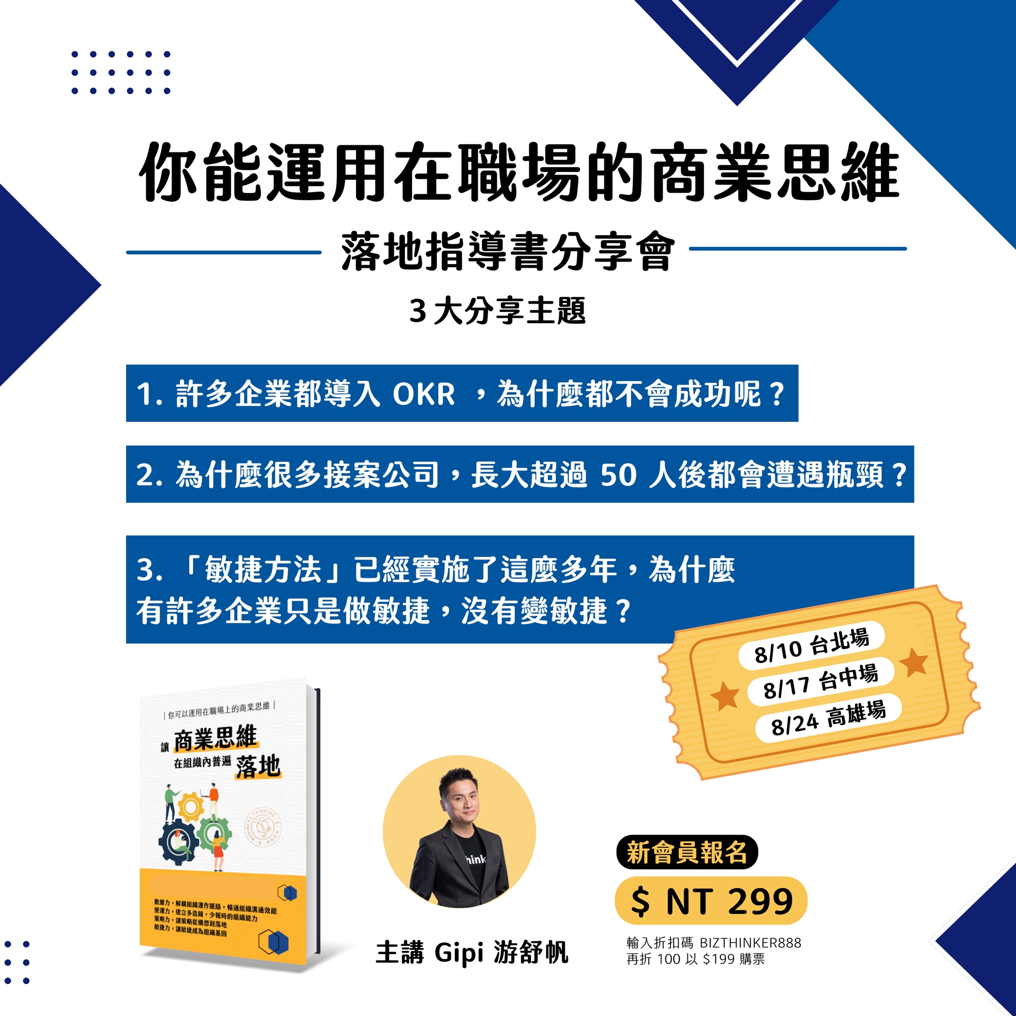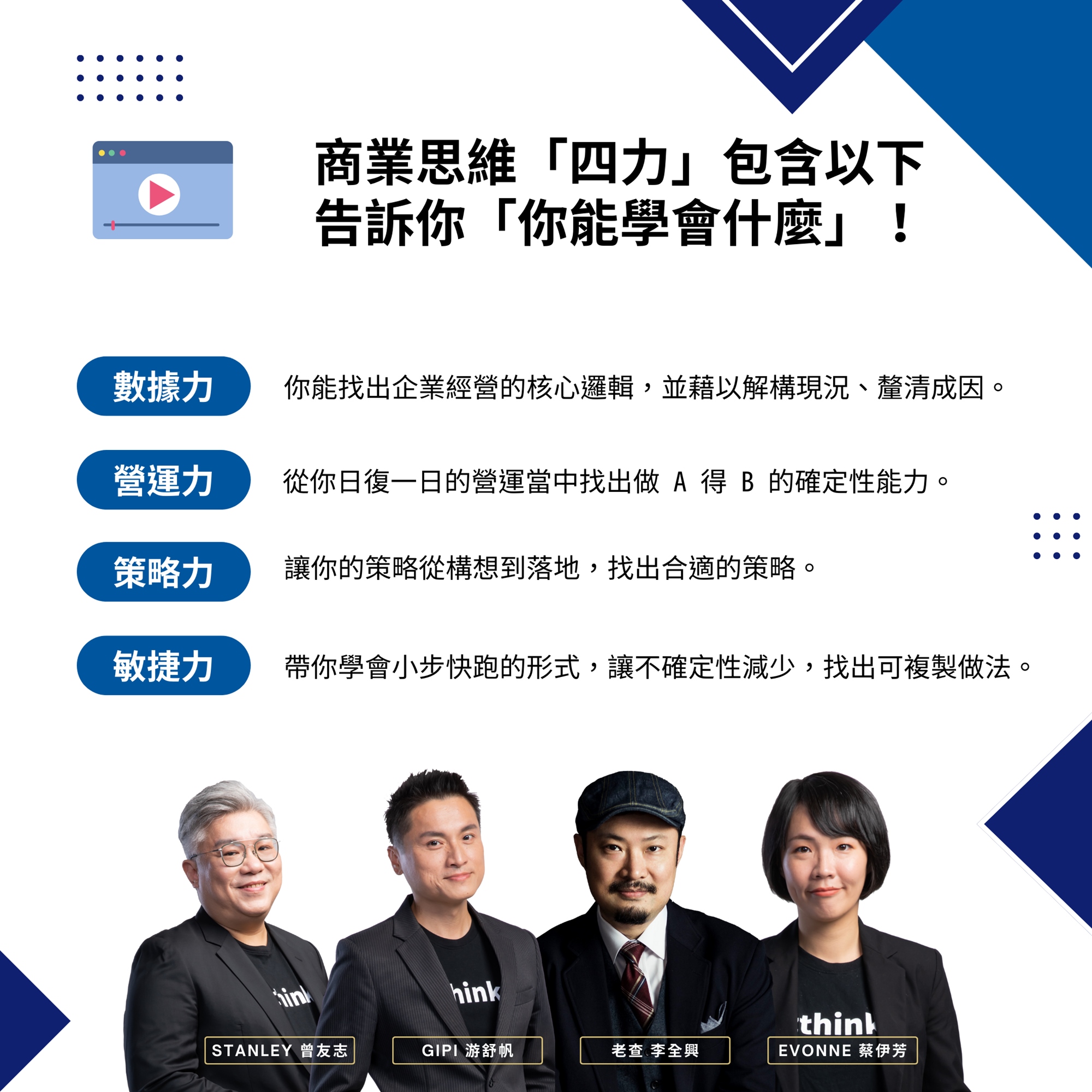 商業思維學院院長 Gipi 游舒帆 將以基礎的商業思維四力(數據力、營運力、策略力、敏捷力)為出發點,透過產業、職能、組職現況、個人角色、部門別等不同切入點,一一告訴你,該如何在職場中運用商業思維,讓你找到對的工作方法,工作效率提升到 100 分!