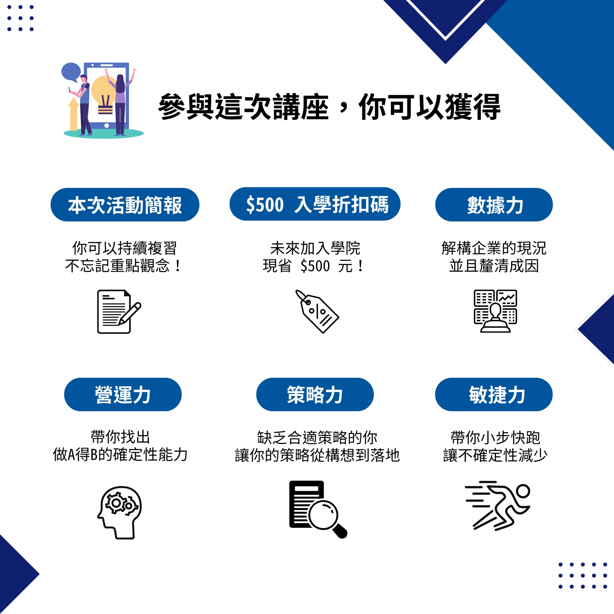 若已是商業思維學院學員,可以到學習系統上報名,票價有額外的優惠,還可以提供 $100 元折扣碼給朋友一起來參加!