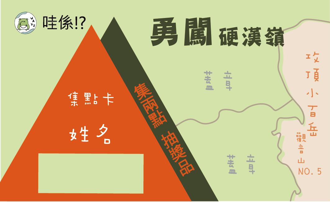 途中會設置兩道關卡,完成後可獲得集點蓋章,集滿兩格,即可在終點站硬漢碑,投入至摸彩箱中,於11點後會進行模彩。