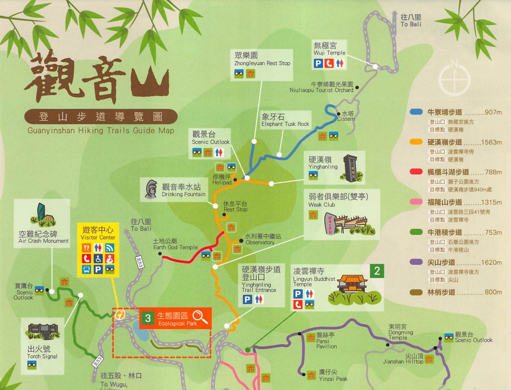 海拔600M,小百岳No.5,觀音山位於五股、八里、林口三區交界,有18個連峰,山形彷如一座橫臥觀音,守護著淡水河的左岸,隔著淡水河與大屯山群遙遙相對,是台灣地區火山景觀分佈最密集的地區。硬漢嶺是觀音山主峯,上有一硬漢碑,因憲兵部隊曾以此為訓練「硬漢精神」地點而得名。可眺覽台北101、圓山大飯店、關渡大橋、淡水漁人碼頭等景觀。硬漢嶺登山步道,與楓櫃斗湖步道交會後,景觀豁然開朗,令人心曠神怡,沿途設有多處涼亭可供休息,並能眺望周邊景緻,沿途盡是林蔭,是假日外出踏青的絕佳選擇。共有近2000石板階。