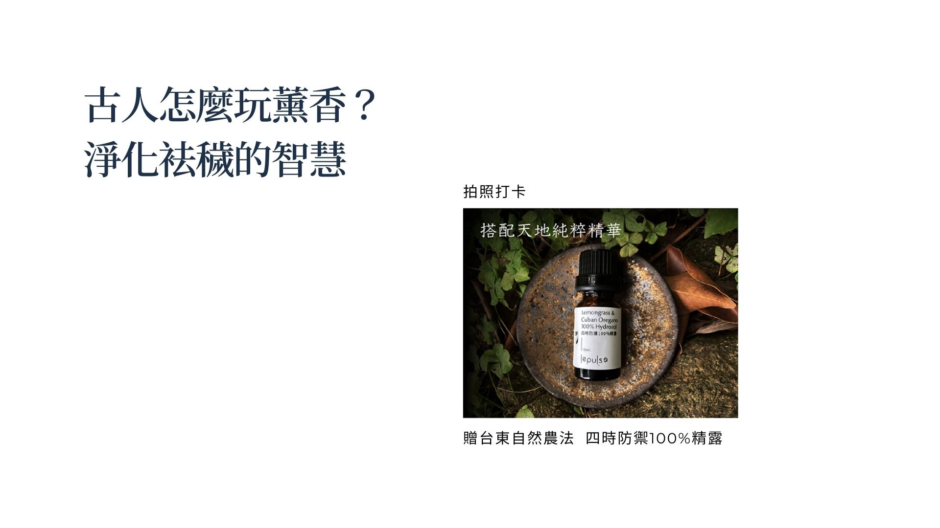 體驗講座出席照片打卡 #文房 #四時草堂,就可獲贈台東自然農法蒸餾純露茶樹綠薄荷「四時防禦100%精露」10ml,把植物香氛防禦力帶回家