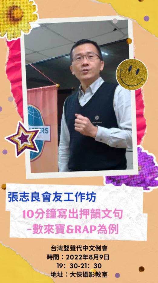 8/9「10分鐘寫出押韻文句 - 數來寶&Rap為例」工作坊與中文例會,會議包含: