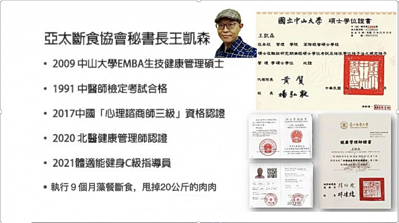 王凱森祕書長係中山大學海洋資源系與EMBA高階經營管理碩士,亦獲台北醫學大學「健康管理師」認證,及中華民國健身運動協會「體適能健身指導員」認證,更有多年的實務經驗;他與周理事長也於去(2021)年合著「168斷食減重完全手冊」,提供給大家具體的參考書籍。