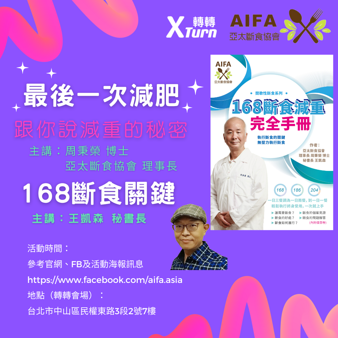 亞太斷食協會成立多年,係結合產業界、政府相關部門及學術界,共同推動間歇性斷食的飲食習慣,以改善肥胖、提高生活品質,王凱森祕書長表示,這場健康講座主題,分別是周秉榮博士主講的「這就是你最後1次減肥」,及個人主講的「如何掌握168斷食的關鍵」。