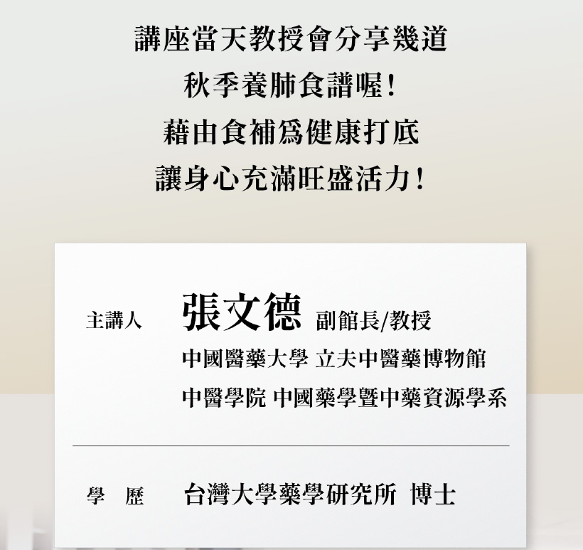 【醫食同源!秋收養肺篇】張文德教授 線上互動講座