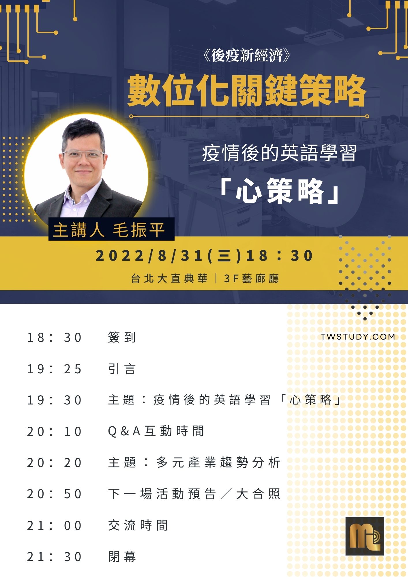 原定8/18台北實體講座因講師確診COVID-19,導致無法出席當天活動,本場活動將延期至8/31台北大直典華3F藝廊廳。