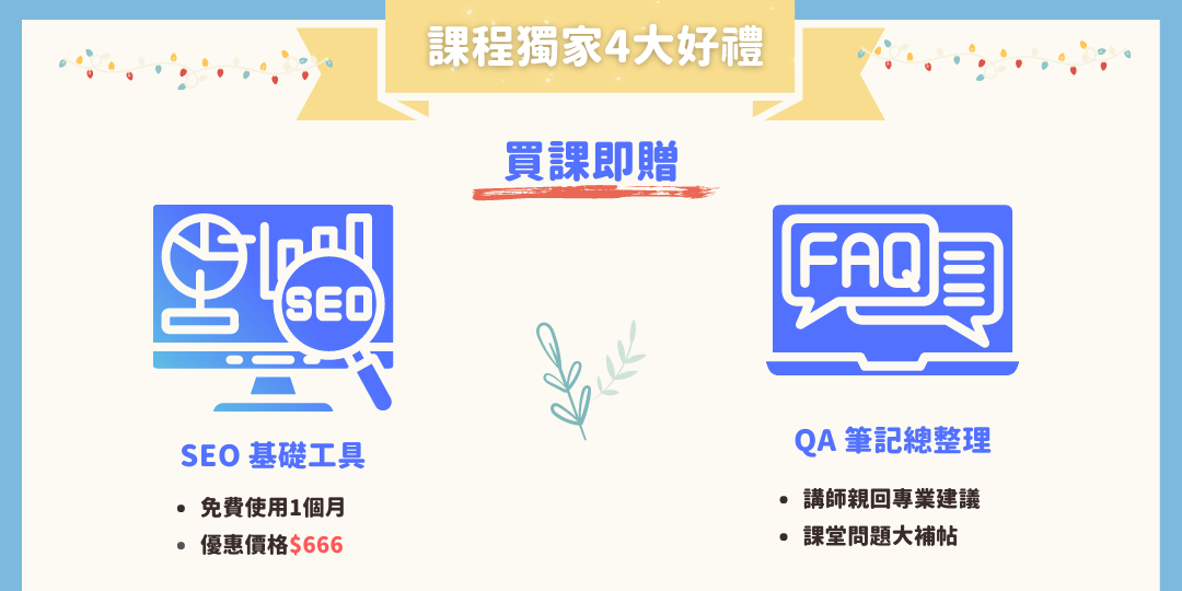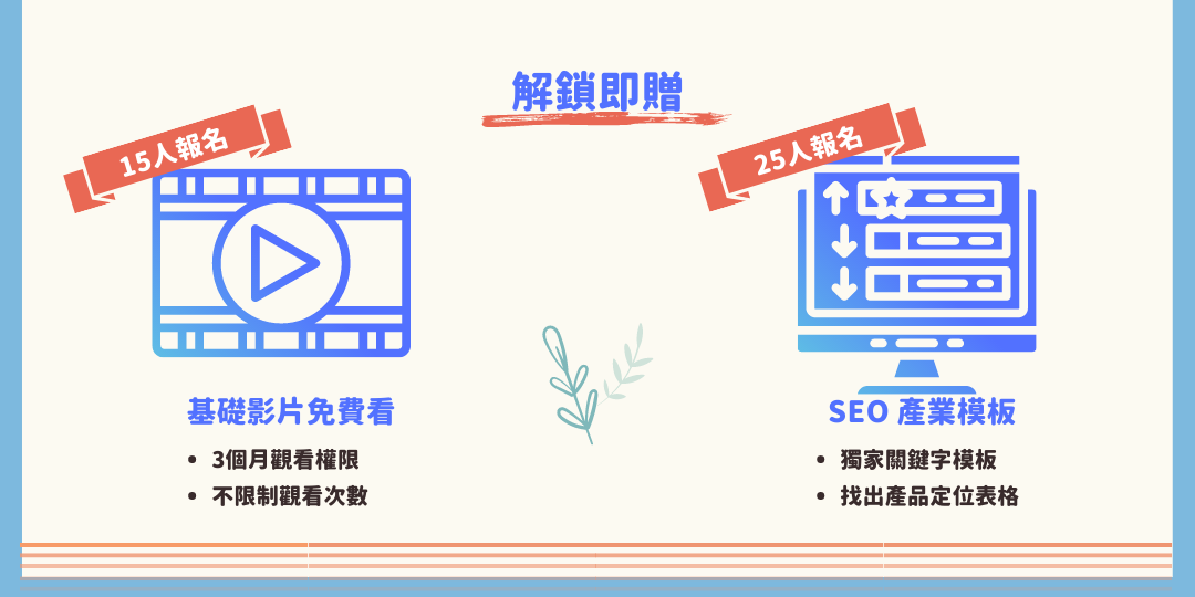 本堂課程除了給你完整的 SEO 攻略,更送你一個月基礎版 $888 Ranking 工具,達到報名門檻還會送你基礎觀念影片和產業模板,讓你只花 $666 就能一次擁有課程和工具,更等同於獲得一間 SEO 外包公司,解決 SEO 所有問題,你不必再擔心網站流量及排名,無痛登上 Google 首頁!