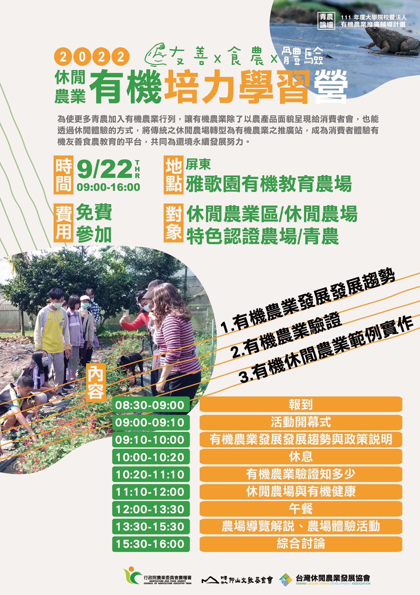 隨著國內旅遊之熱潮,以及有機意識的抬頭,休閒農場之於民眾不再只是單純的出遊,更多民眾選擇以有機生態與食農體驗為主的休閒農場作為出遊的首選目標之一。因此,休閒農場朝向有機化發展將為未來不斷持續的目標。主辦單位為鼓勵更多休閒農場之業者或青農持續強化自身產品例外,最後一站來到屏東由黃璋如教授所主持的雅歌園食農教育農場,透過課程與經驗分享,輔導更多業者與青農將傳統休閒農場轉型為有機農業之推廣站,成為消費者體驗有機友善食農教育的平台,共同為境永續發展努力。