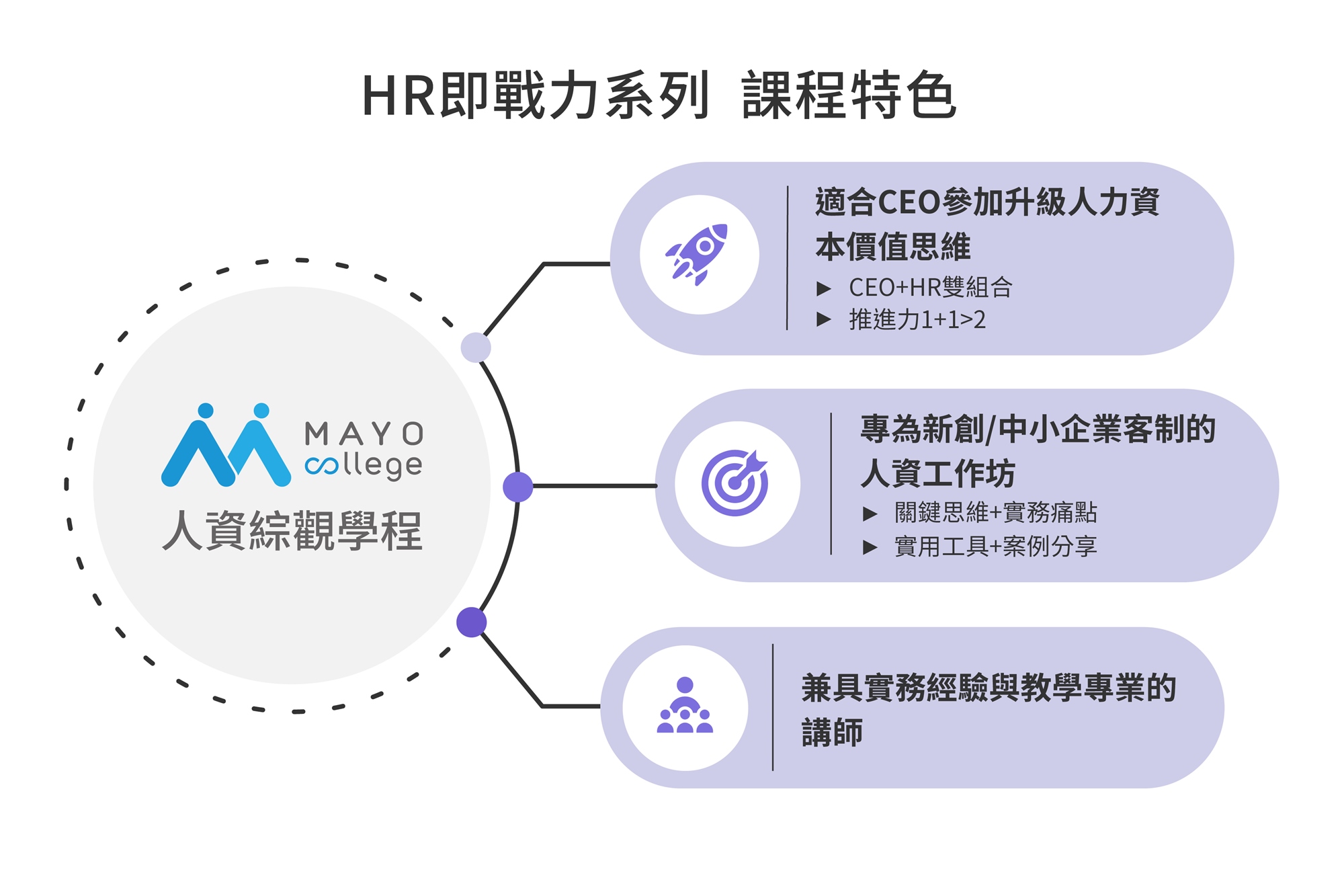 MAYO College特別為新創與中小企業CEO和人資夥伴規劃這堂結合理論與實務的工作坊,從WHAT、WHY、HOW三大面向,一一解析激勵留才的理論與最佳實務做法,打造成功留任關鍵人才的組織環境!