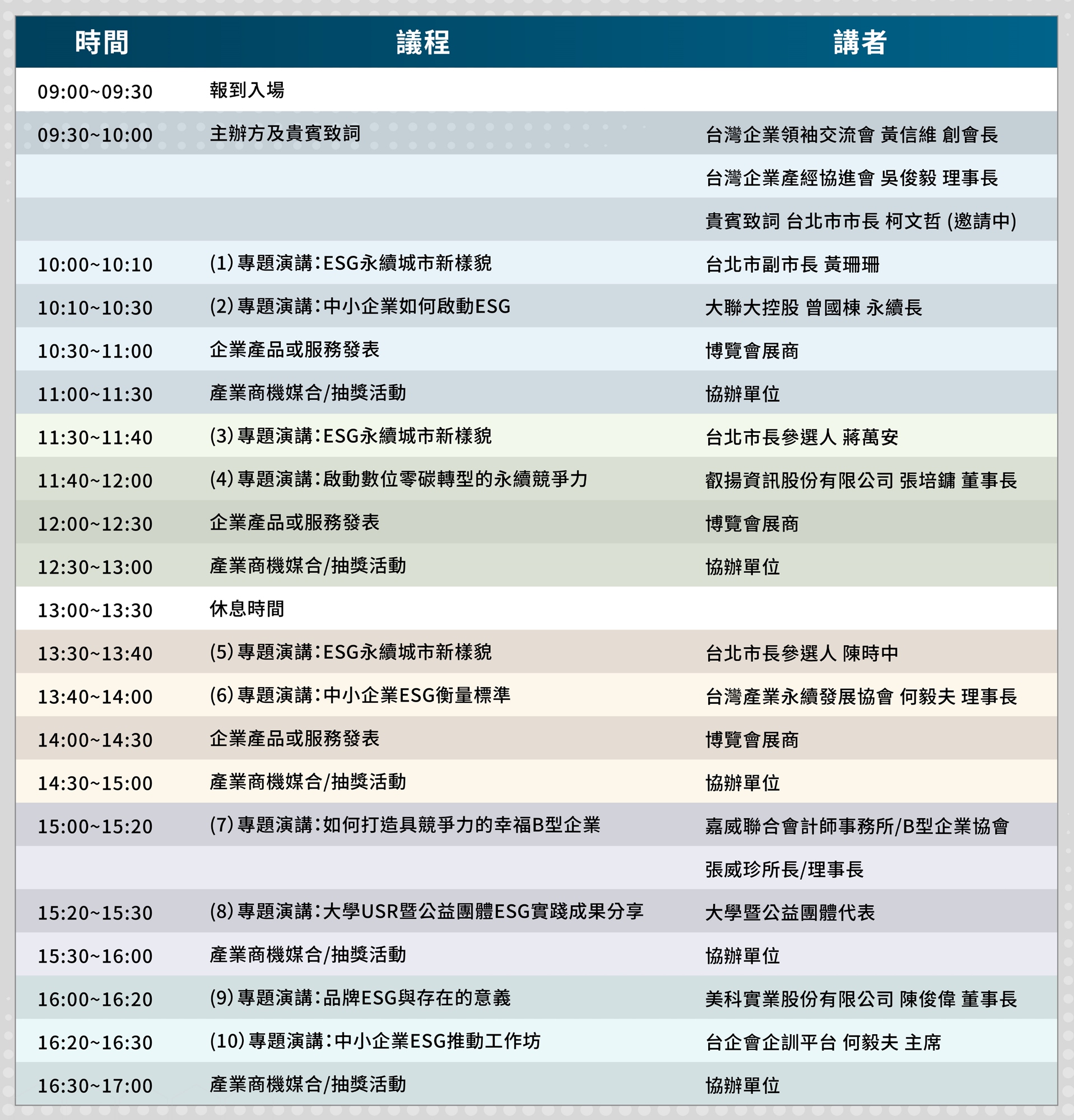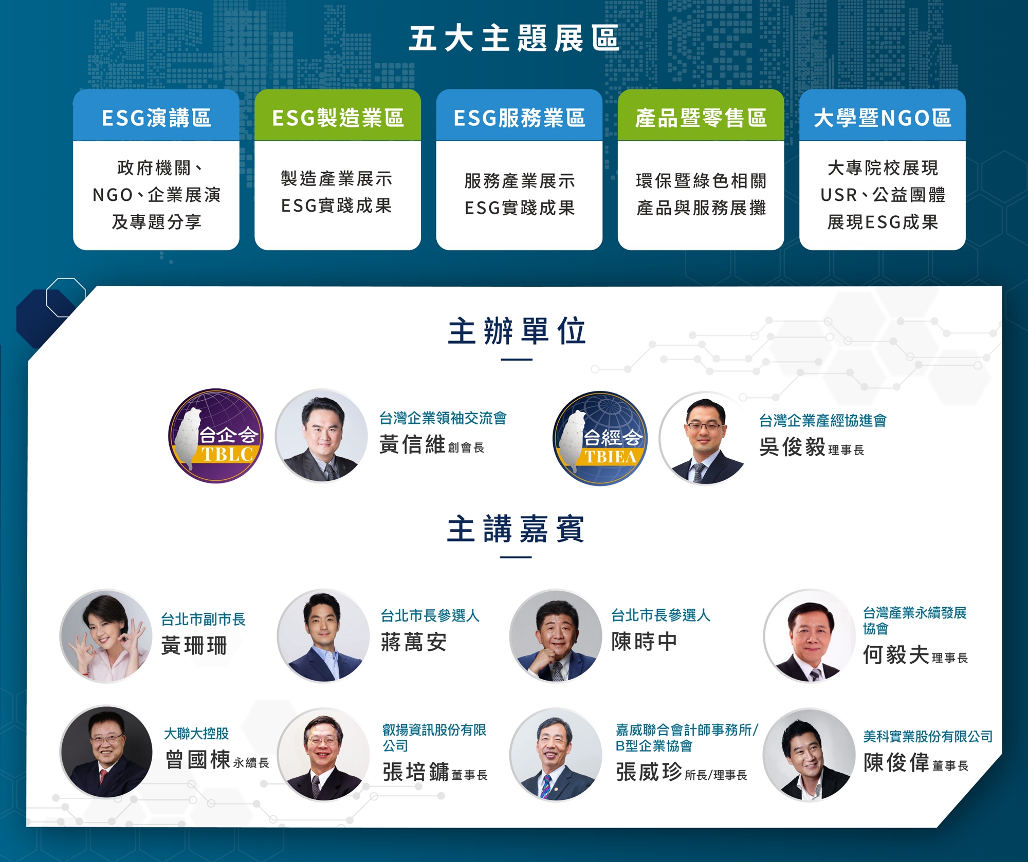 🔰五大主題展區:「ESG演講區」、「ESG製造業區」、「ESG服務業區」、「產品暨零售區」、「大學暨NGO區」。