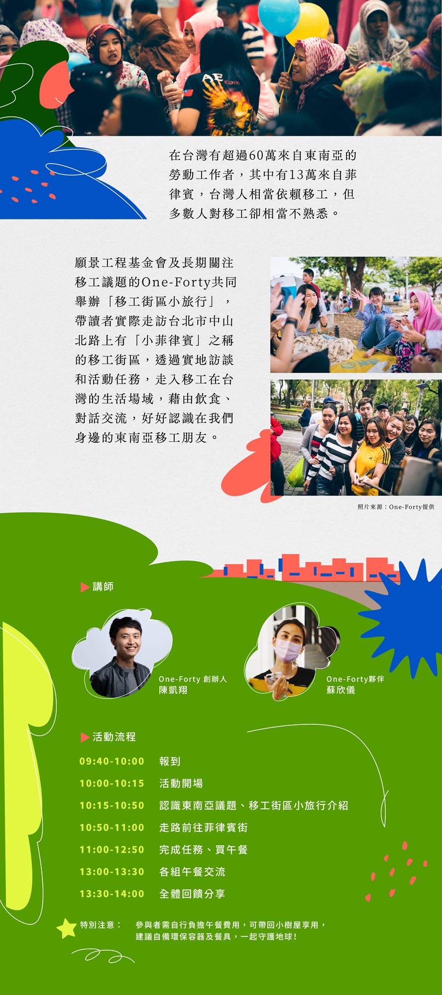 移工街區小旅行 【日期】2022 年 8 月 21 日(日)【時間】10:00 - 14:00(報到時間為09:40)【地點】小樹屋|大葉桉 203(臺北市中山區民權西路20號2樓-203房)【共同主辦】願景工程基金會、One-Forty