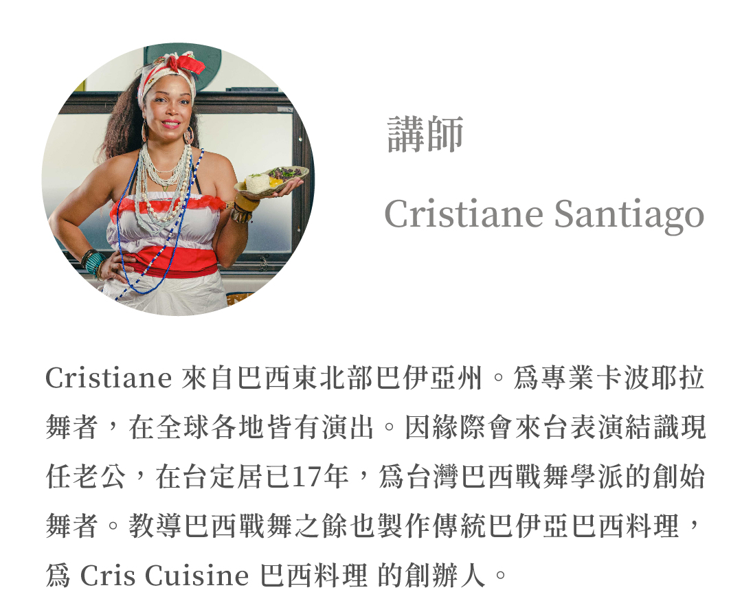 不只戰舞的示範演練,工作坊也將帶來巴西國民雞尾酒 卡琵莉亞 Caipirinha,以及巴西東北地區巴伊亞家庭料理(巴西香腸、米布丁)。巴伊亞被視為巴西的小非洲,由於殖民時期的被迫為奴的非洲人多落腳於此,這裡的文化與美食混合了歐洲、非洲與美洲的元素,同時也是巴西戰舞的起源地。
