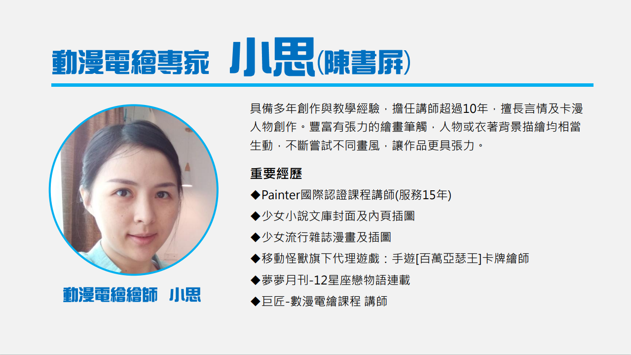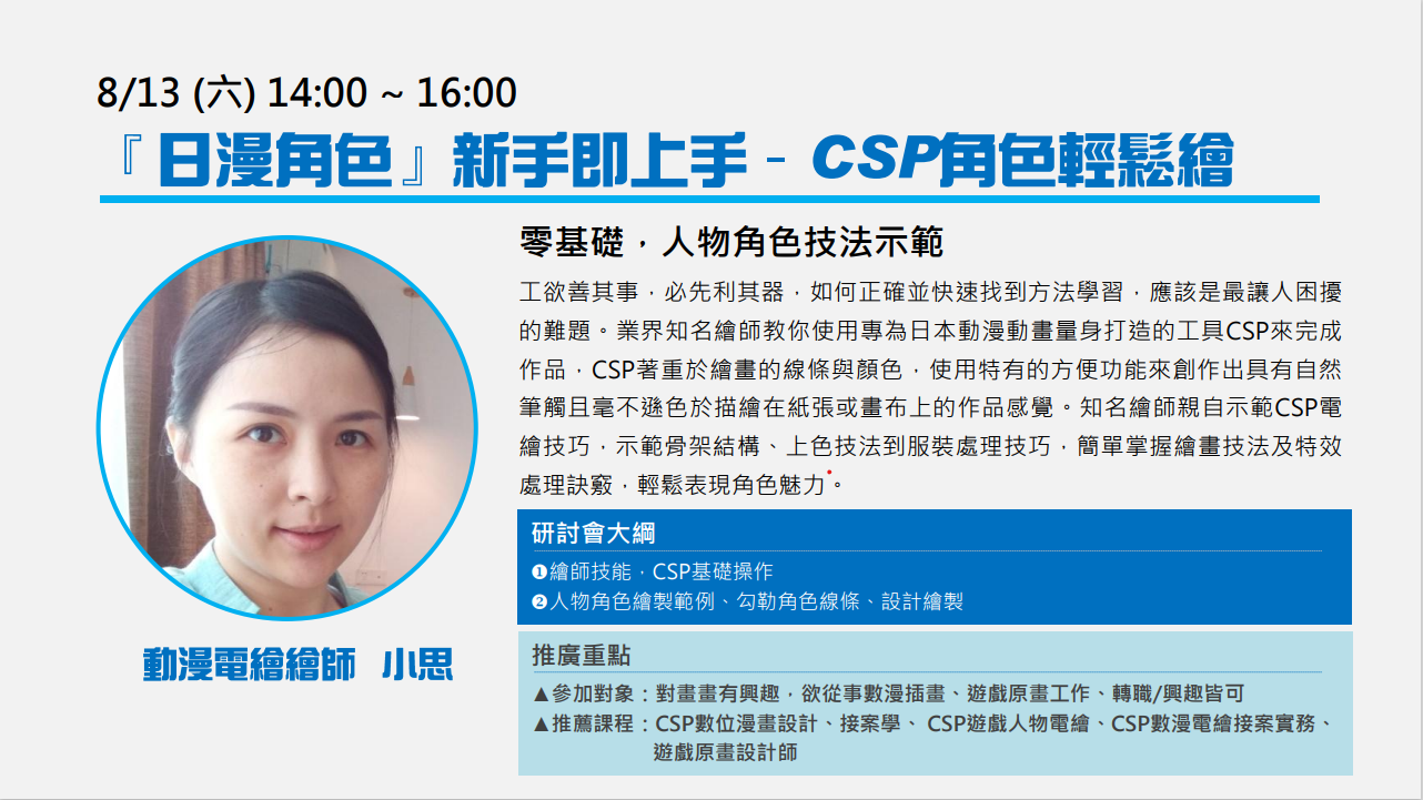 電繪技巧講堂來囉!喜歡畫畫的你不要錯過!小思老師將提供範例,一步步帶你完成日漫人物的局部繪畫上色!不但能學到軟體基本操作及繪畫技法,老師還會分享一些職場接案的應用範例,有趣又實用!名額有限,這次不要再錯過~快來報名~ ( 線上直播/實體教室)