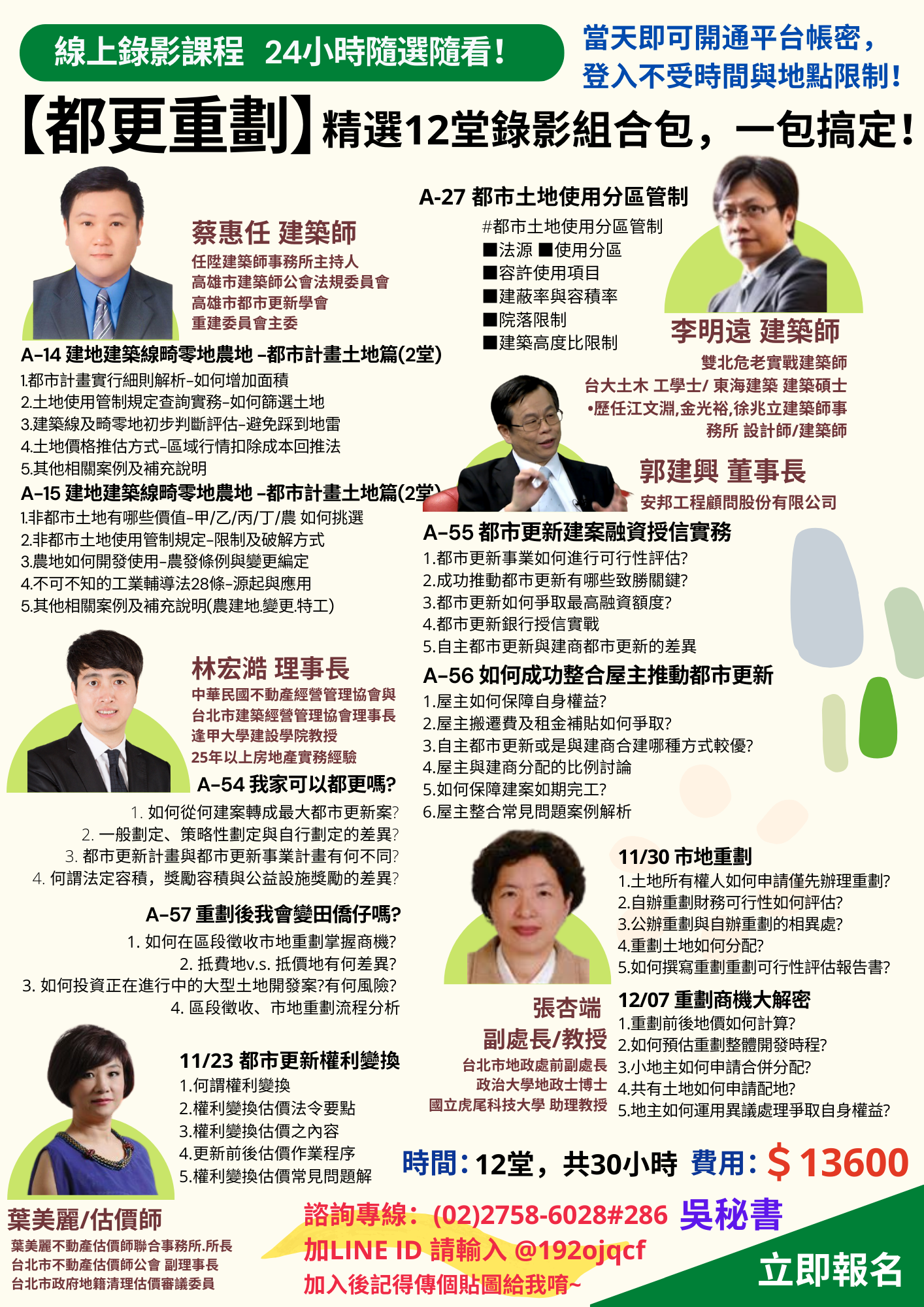 【線上課程】都市更新&重劃商機精選12堂錄影組合包,線上防疫價 13600元!完款當天立即開通!