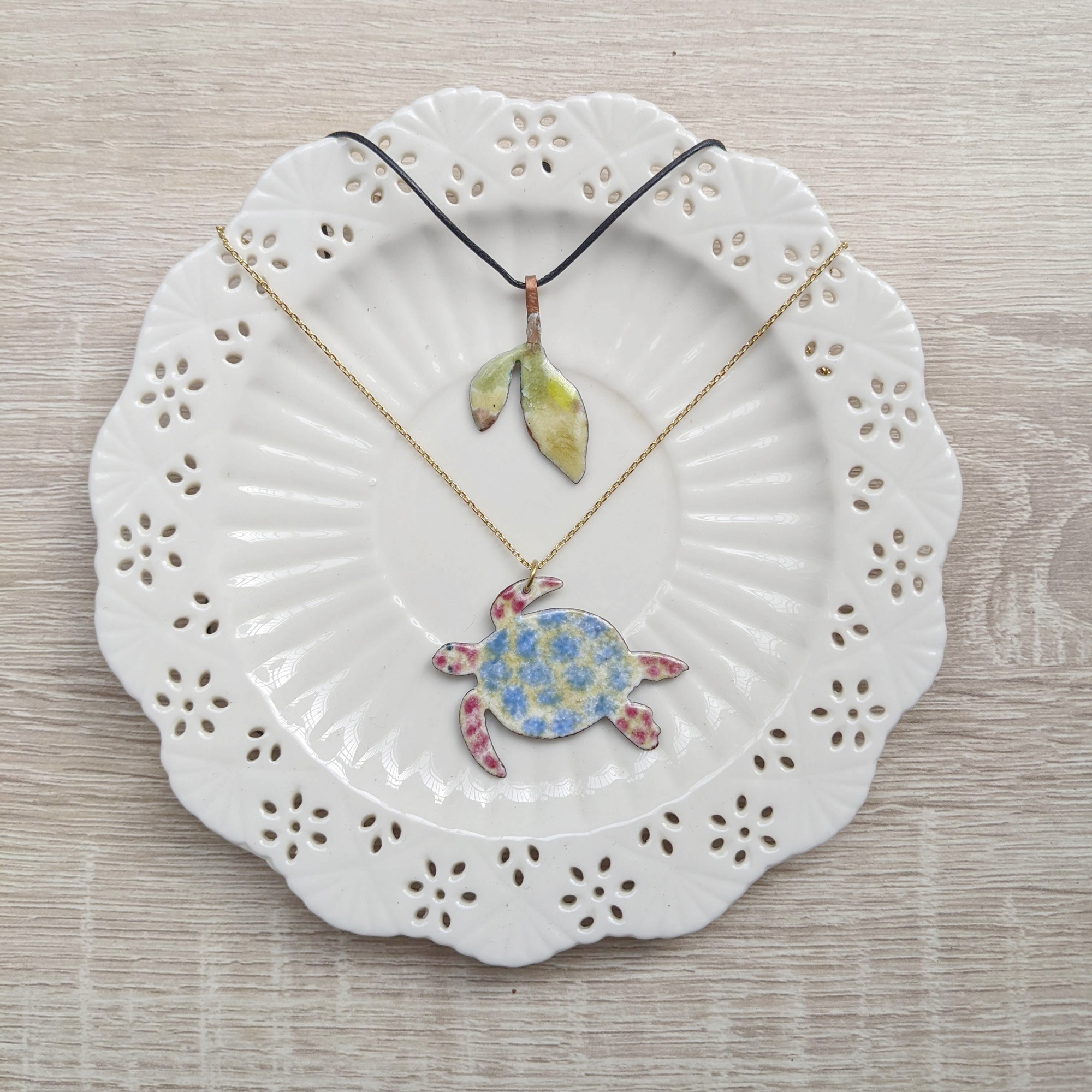 製作好的琺瑯墜子可選擇 皮繩 或 黃銅鍊條 變成獨一無二的項鍊。