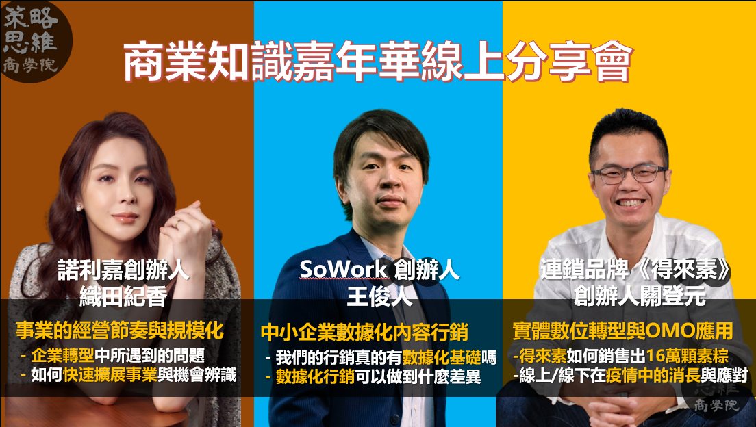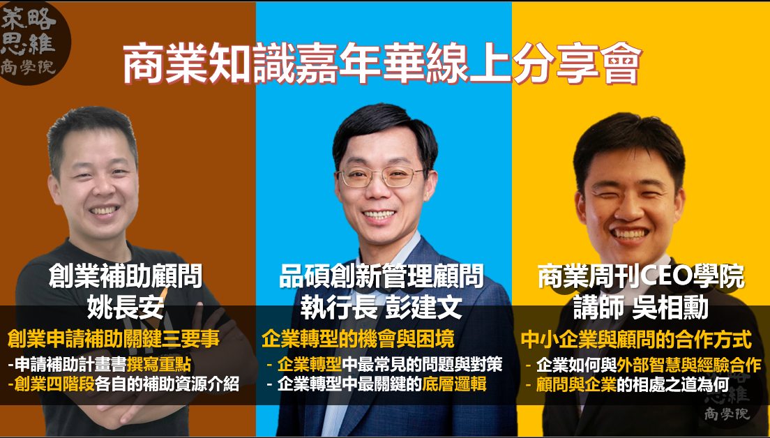 主辦單位《策略思維商學院》致力於每年服務100位中小企業主,透過一整年線上/線下的混成教學,協助中小企業解決當下的問題,學員以中小企業主和高階主管及專業人士為主。去年已有90位加入我們,期許今年有100位加入,為他們創造事業上的成長,成為台灣中小企業最強的後盾是我們的理念!