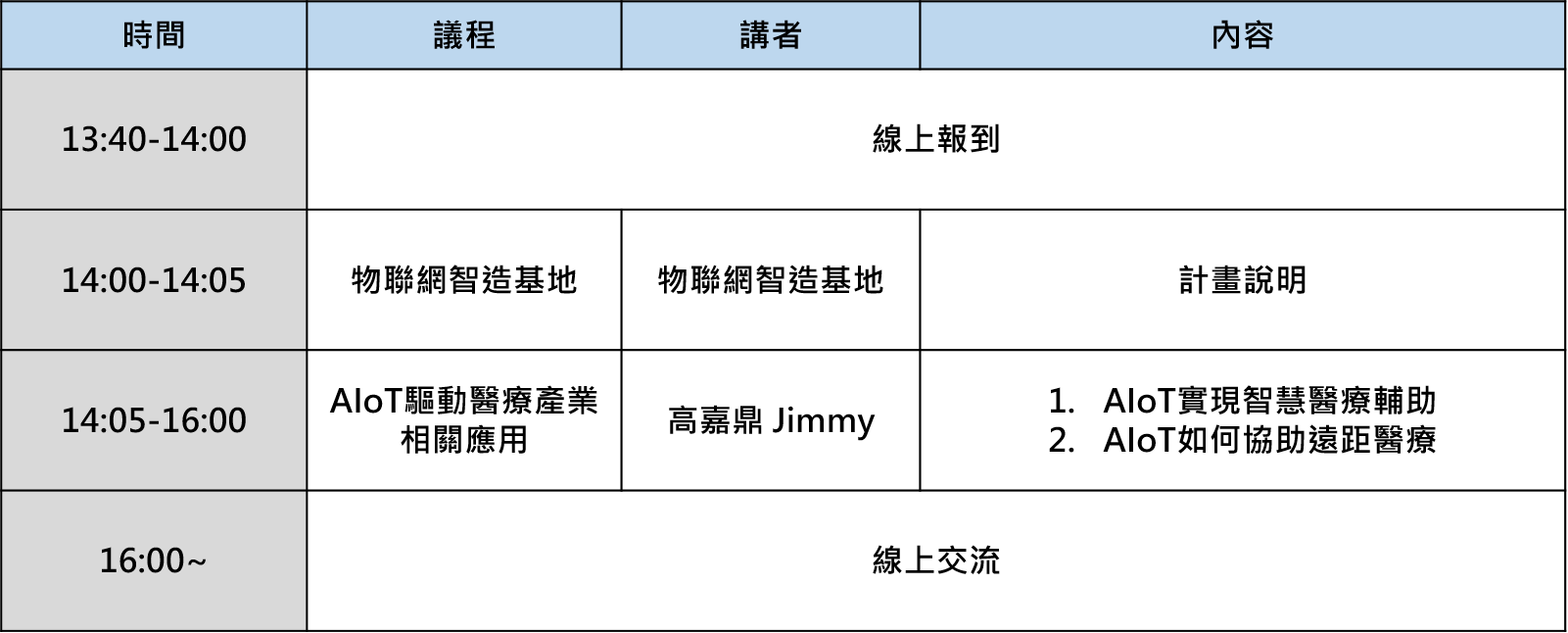 此次課程主軸將會環繞在如何透過AIoT實現智慧醫療輔助,及AIoT如何協助遠距醫療,此課程為免費活動,歡迎報名跟我們一起來了解醫療產業與AIoT科技應用上的結合~