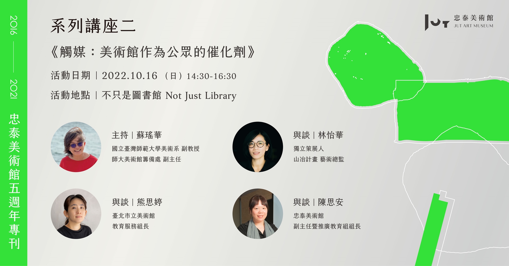 💡主辦單位保留活動異動之權利,如有其他未盡事宜及防疫規定,將依忠泰美術館官網及Facebook粉絲專頁最新公告為主。活動聯繫: eranchang@jutfoundation.org.tw,(02) 8772-6757 ext.3551。