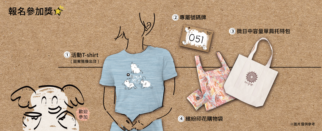參加禮:easyoga 活動T-shirt、專屬號碼牌、微日中容量單肩托特包、easyoga 繽紛印花購物袋。