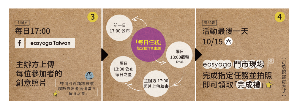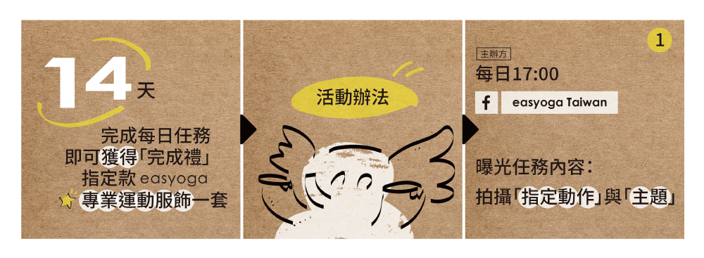 ① 主辦單位每日17:00於 easyoga (中文) 官方臉書,公佈指定動作與任務。