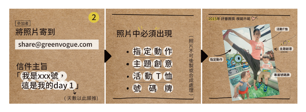 ② 參加者需於隔兩日下午13:00前,拍攝指定動作與任務,將照片以主旨 [我是xxx號,這是我的day 1 ],寄至 share@greenvogue.com 信箱,檔案需為 1mb 以內的 JPG 格式。