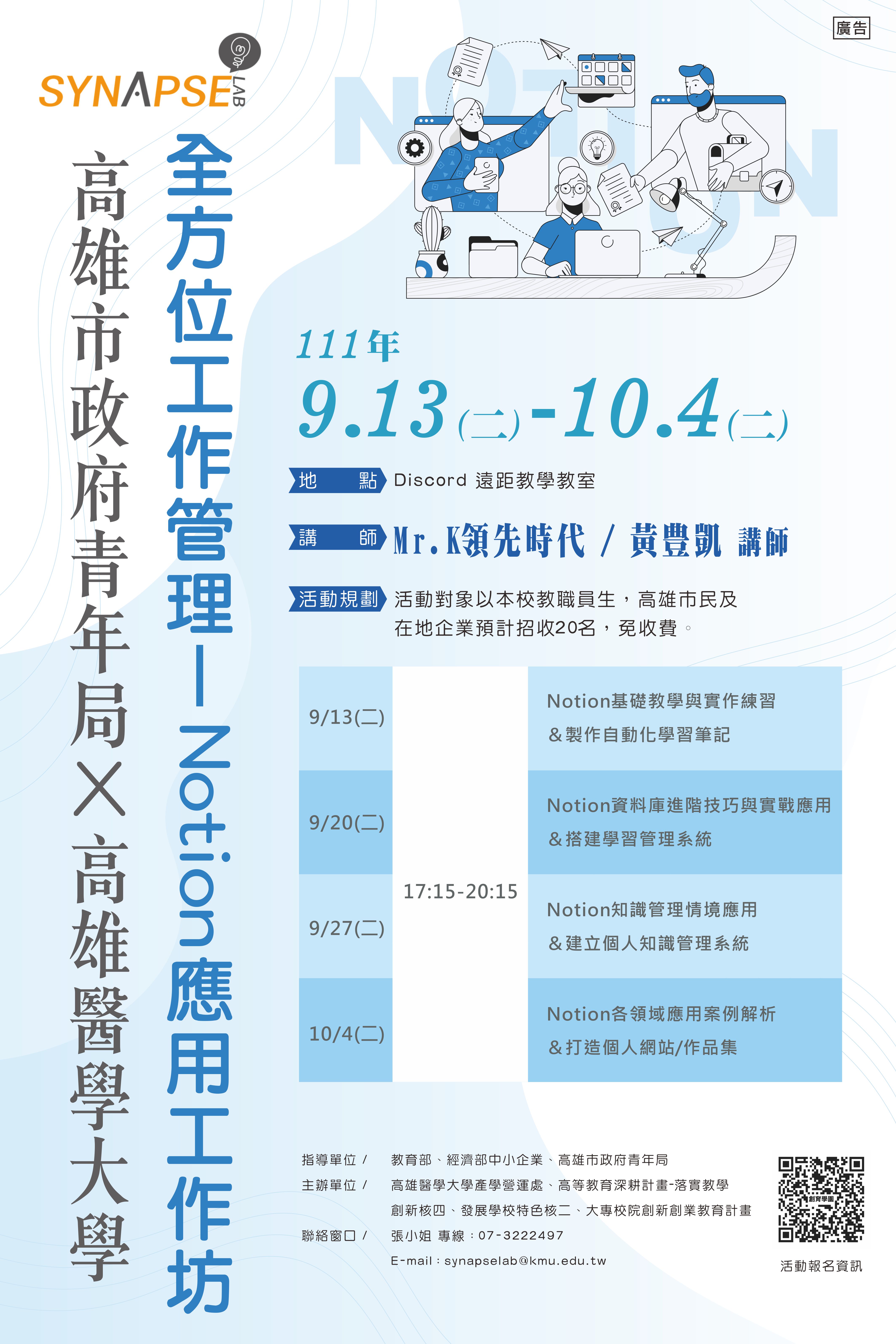 【聯絡窗口】張小姐 專線:07-3222497|單位信箱:synapselab@kmu.edu.tw