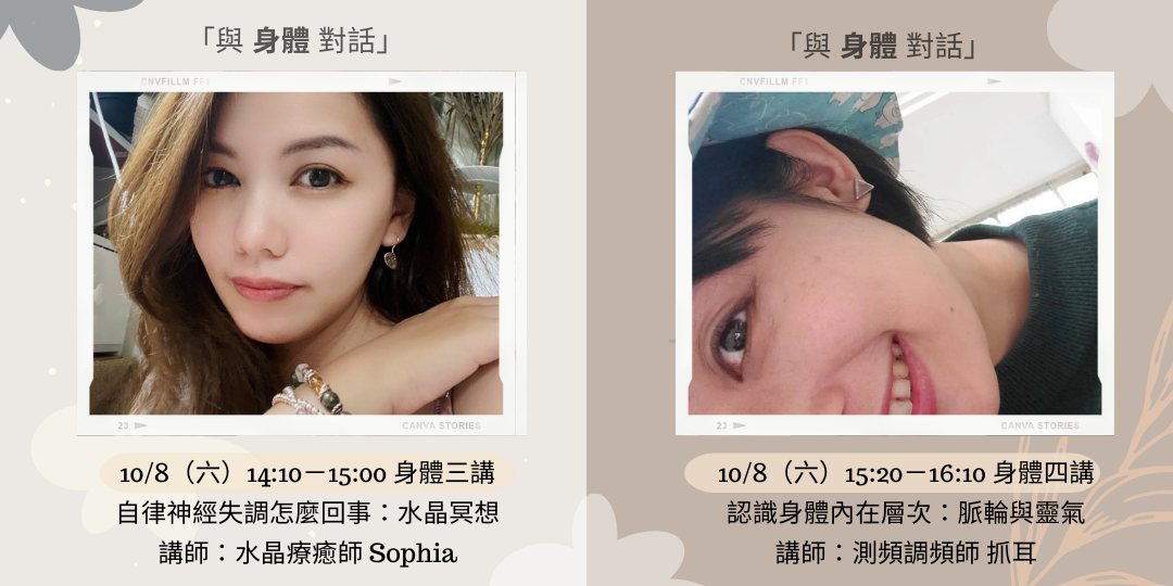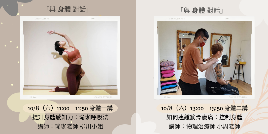 十月,邀請你來參加朵躲雨小姐策劃的「身・心靈聯合講座」,兩個週六、八位講師,陪你體驗身體與心靈的合一。