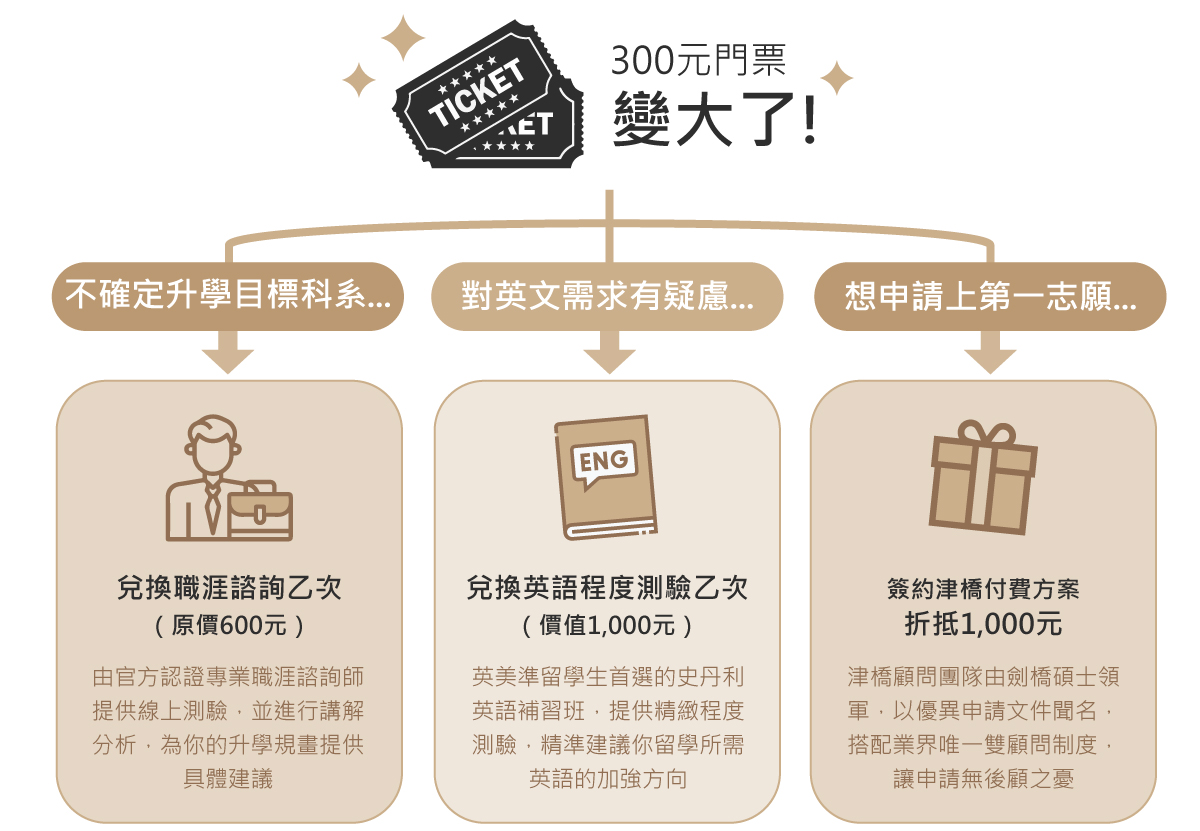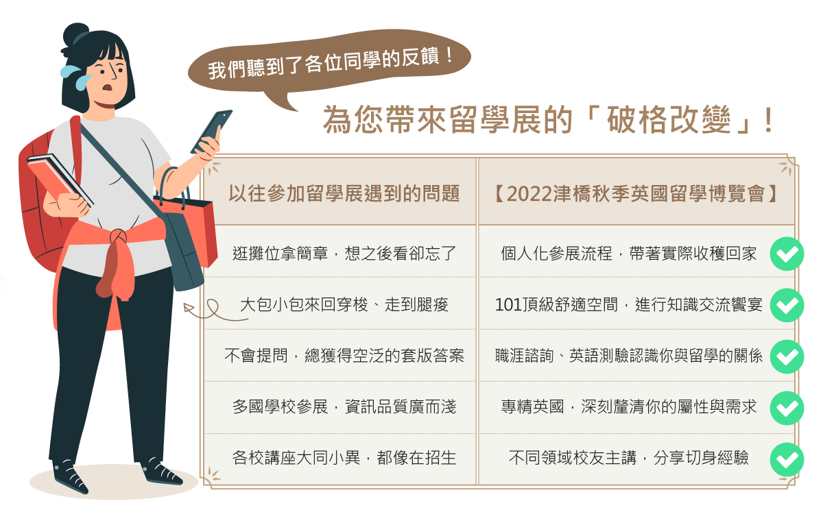 並且,2022秋季津橋英國留學博覽會是首個同時引進「官方認證職涯諮詢」與「留學英語程度測驗」的留學展,想留學卻不知道如何跨出第一步嗎?不妨想想你未來想從事的行業,或是從準備英文做起唷!