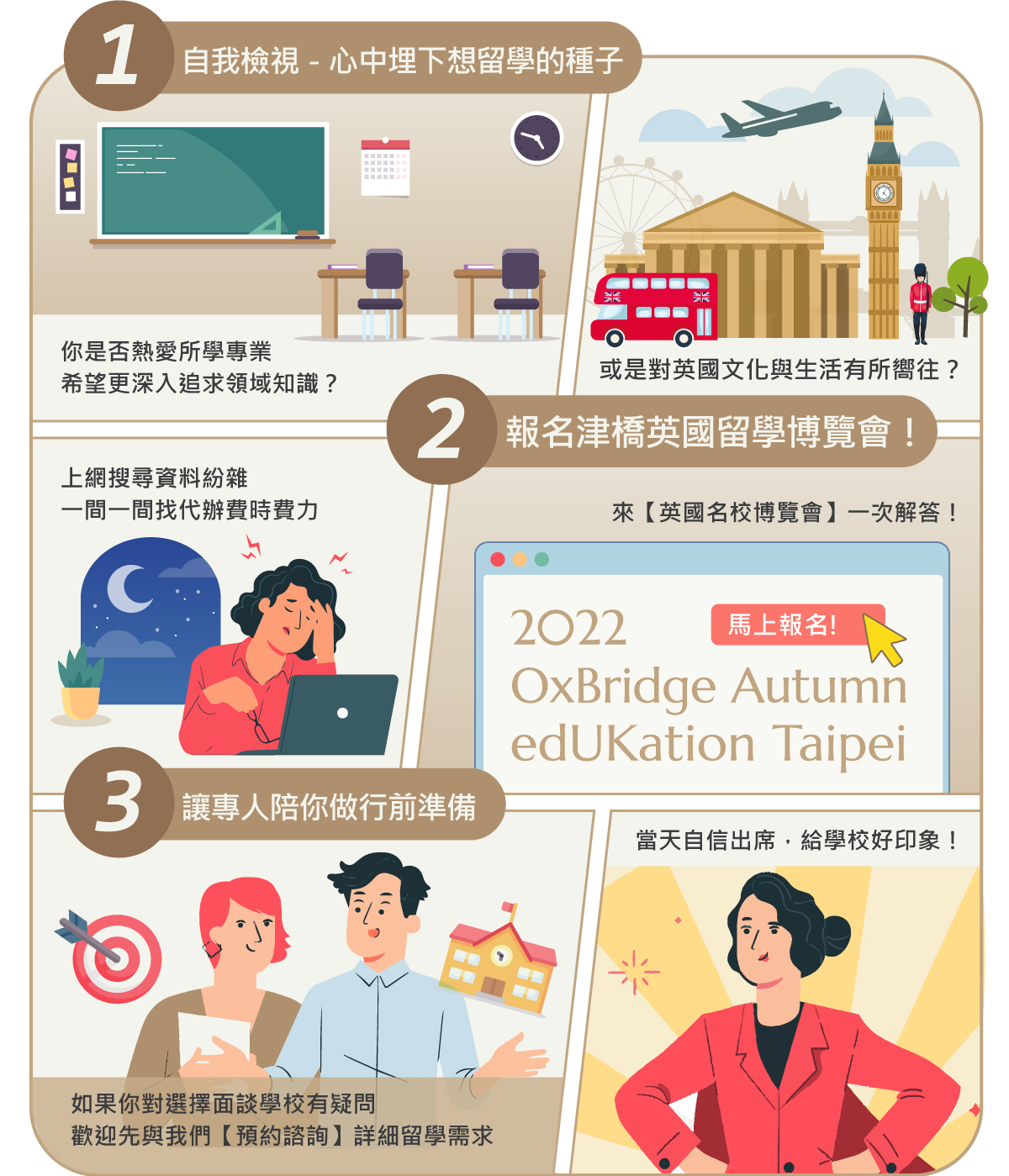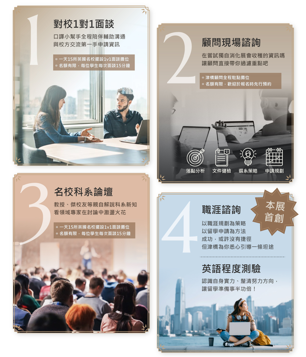 本次展會最主要的訴求是「客製化」──暫時停止在各個留學展會忙碌穿梭,讓我們把時間與精力放在正確的方向。在我們為您準備的舒適環境中,由職涯諮詢發想、從英語檢測入門,與名校專家或暢談、或沉澱;從容而穩健,是本該就屬於你的致勝方法。