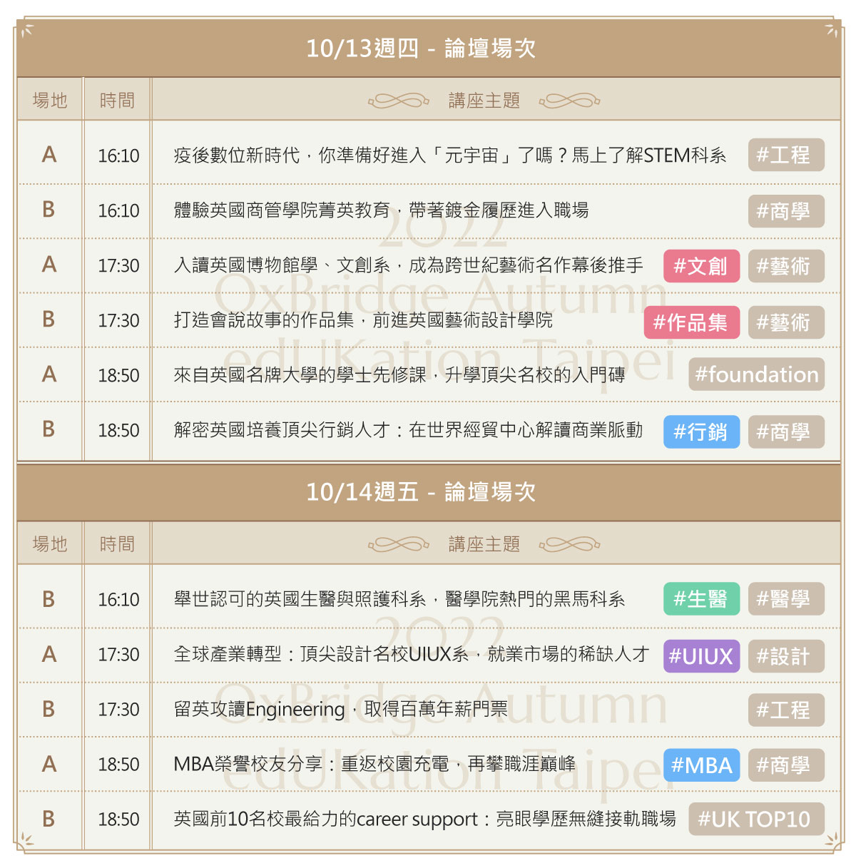 ★因應廣大同學反映需求,我們將在 10/14 週五場 16:10 加開A場的英國工作簽證專題論壇!由於場次不在報名表內,請於活動當日入場後直接簽到參與唷★