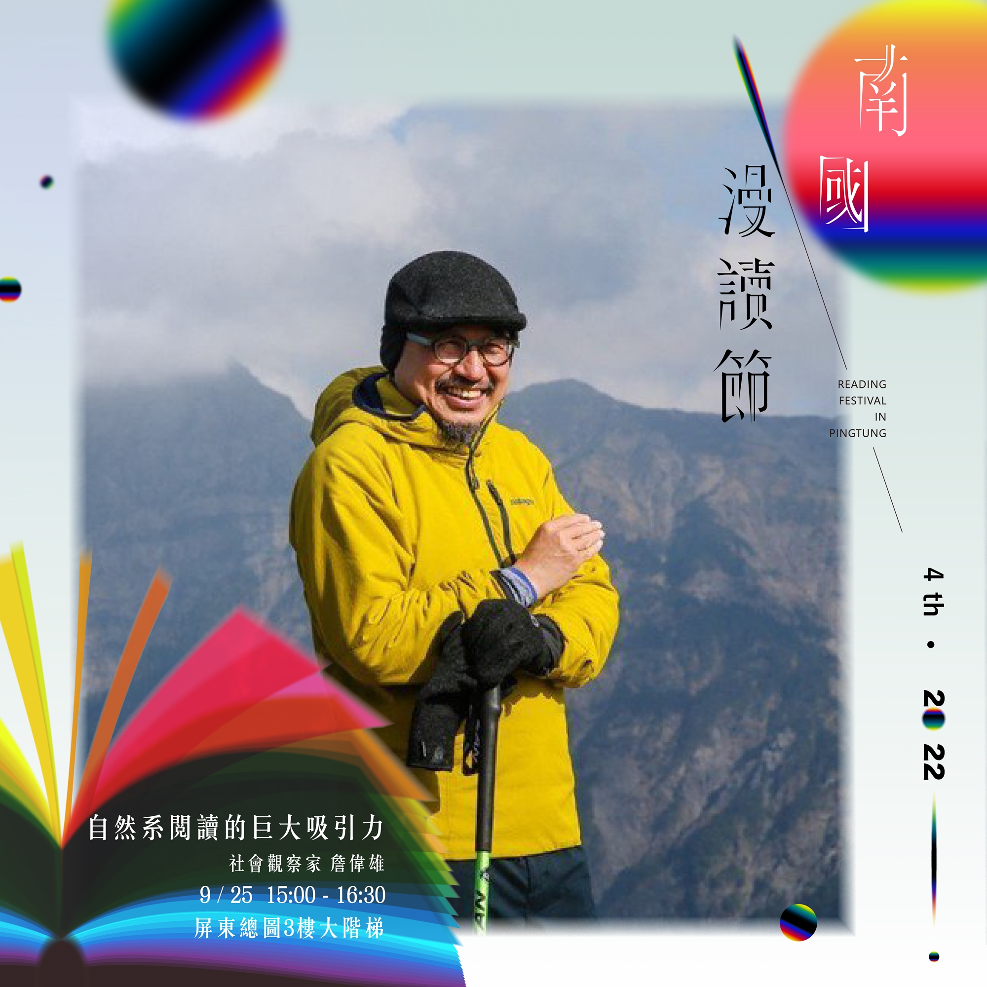 屏東依山傍海,有著得天獨厚的生態魅力,近年登山熱潮興盛,各種自然系或冒險文本都獲得廣泛注目,本場邀請到熱愛挑戰百岳的社會觀察家詹偉雄,在山林裡找到自我的他,要和大家分享自然系閱讀的巨大吸引力。