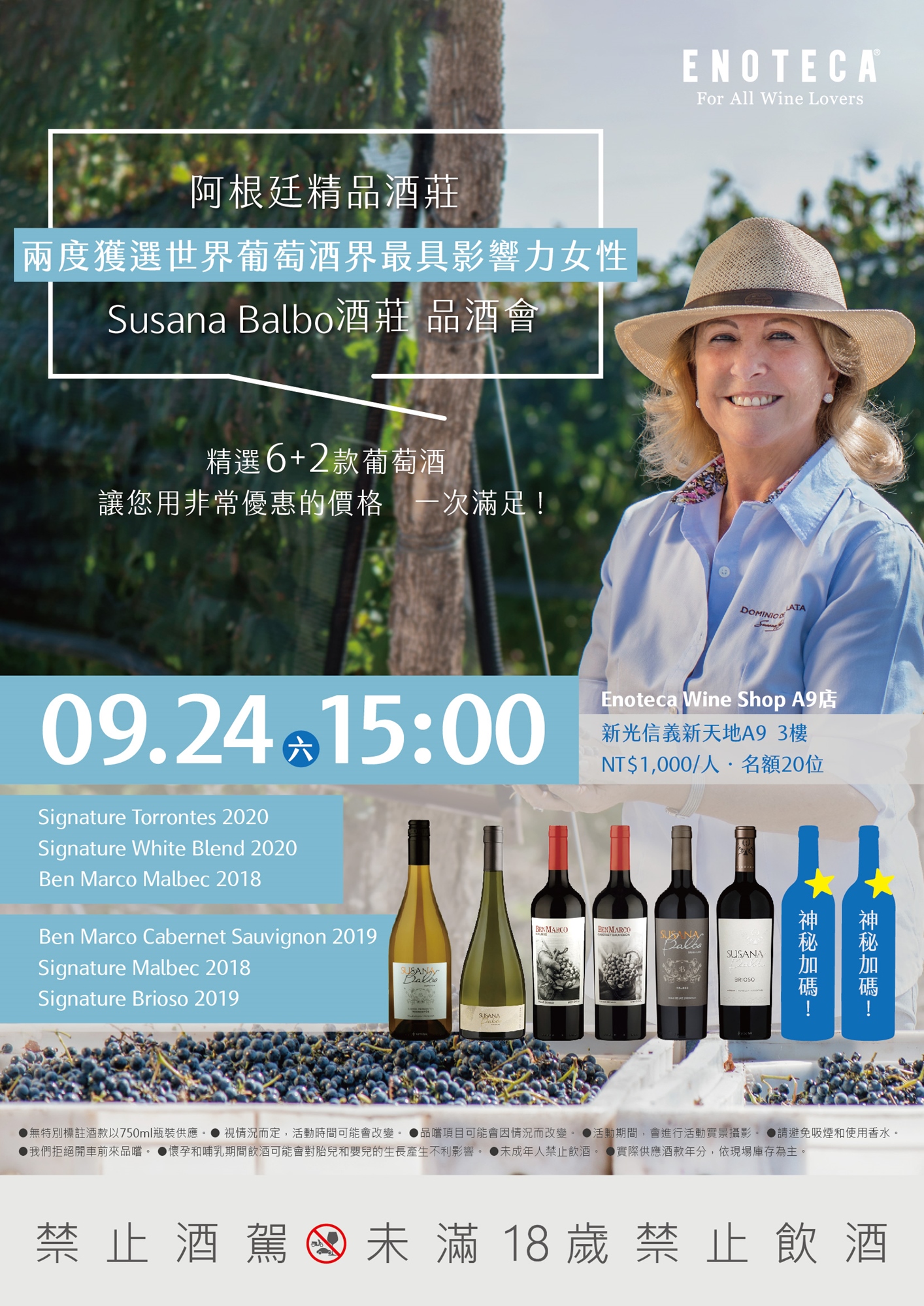 🍷 Susana Balbo ,來自阿根廷的釀酒女王,被譽為阿根廷最有名的女釀酒師。Enoteca有幸邀請各位貴賓,一同前來品飲她傾盡生心血打造的6款優秀酒款,與酒莊額外加碼的2款神秘酒款,讓我們一起,跟著她不凡而帶有傳奇色彩的人生故事到南美探險吧! ✈