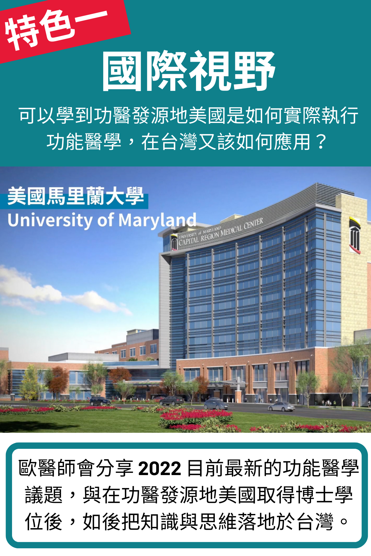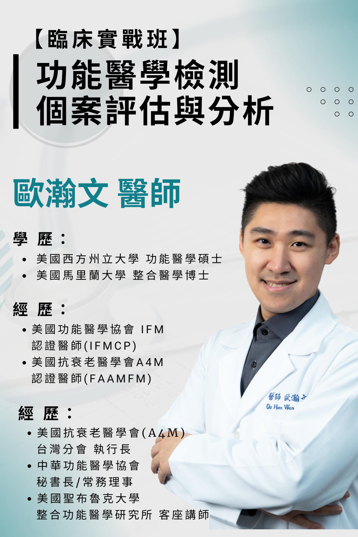歐醫師在功醫發源地美國有相當完整的學習經歷,他在全美第一間功能醫學碩士學程,西方州立大學取得功能醫學碩士學位後,也取得了馬里蘭大學的整合醫學臨床營養博士學位。目前也是瀚仕整合功能醫學中心執行長,有相當豐富的臨床與實務經驗。
