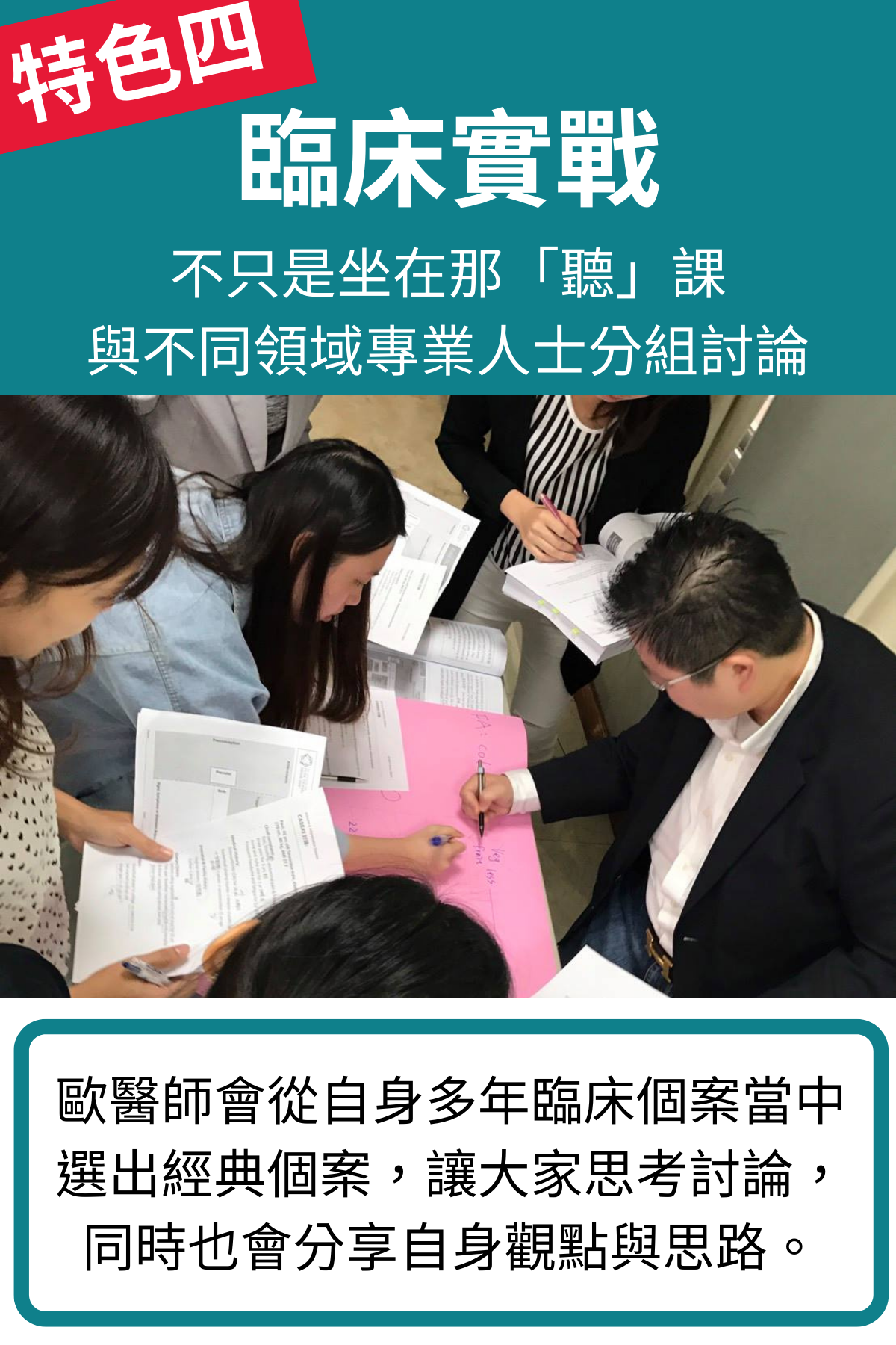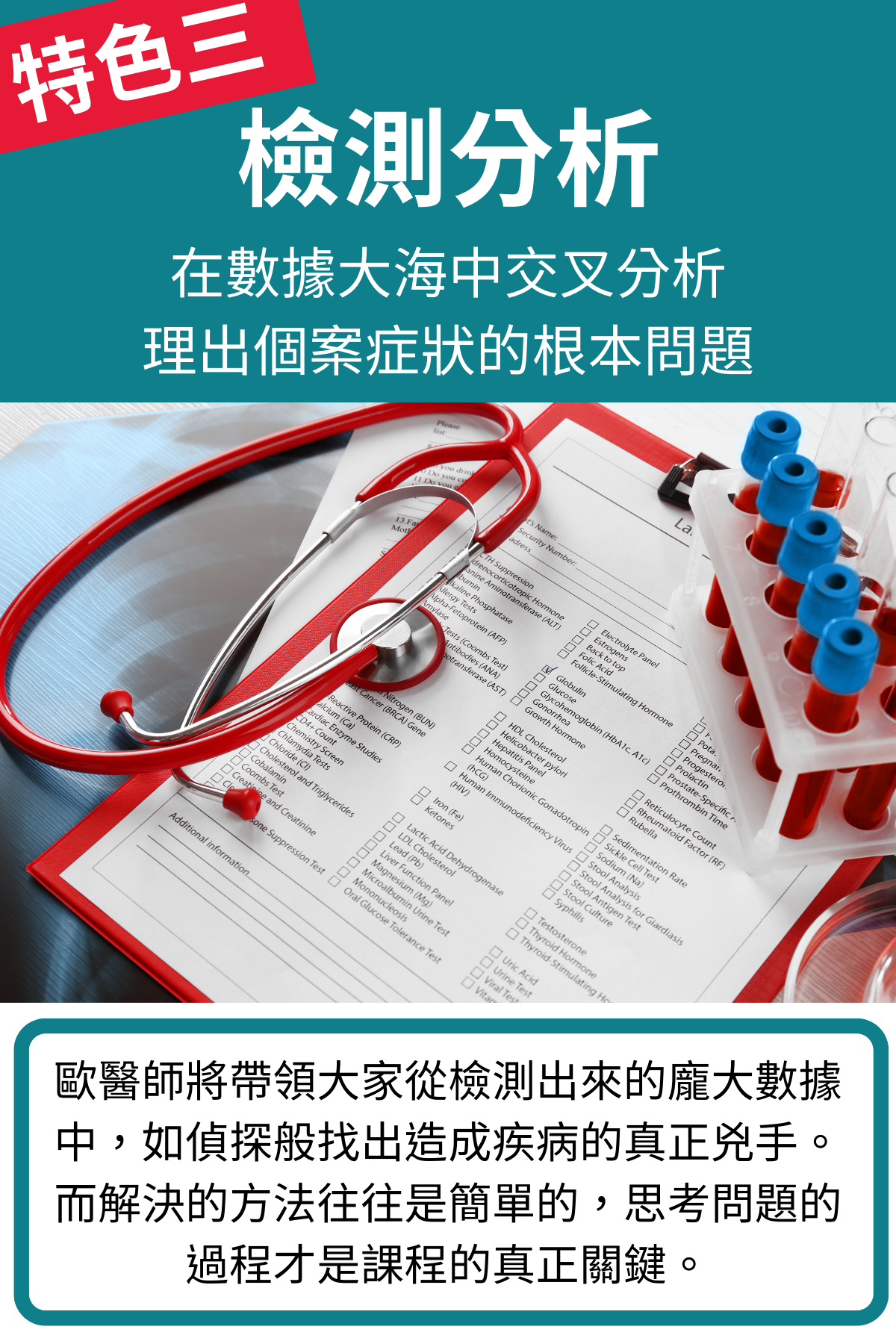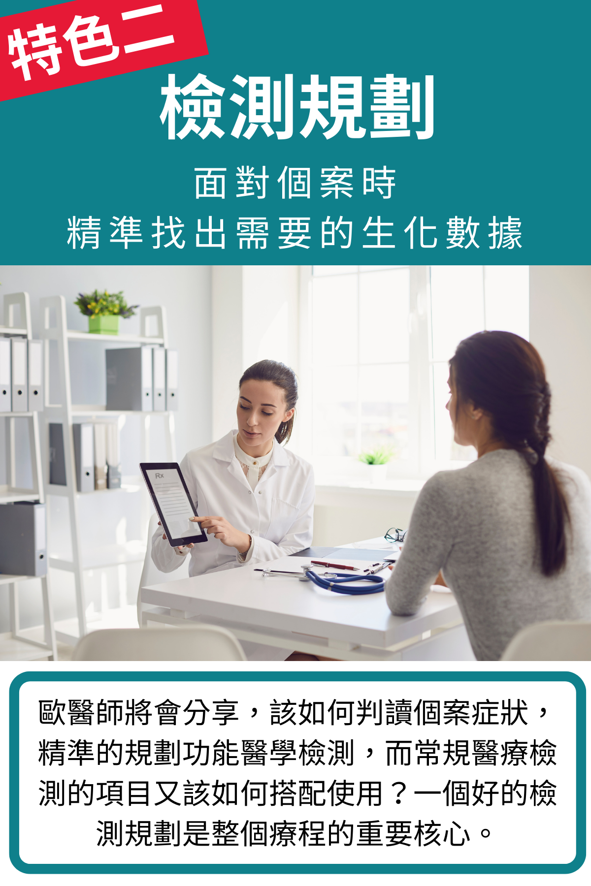 上午學科下午術科,上午歐醫師會把國內外目前對於檢測的最新訊息跟大家分享,此外還會跟大家分享如何規劃與評估檢測。下午就會從真實個案的情境之下,由功能醫學教育中心團隊與歐醫師一起臨床實戰演練。我們會分組,讓大家盡情討與交流看法,最後歐醫師會解說:核心思路,解決方案與後續成效。解說完之後會希望大家連結自己的臨床經驗,有問題再提問,做一個完美收尾。