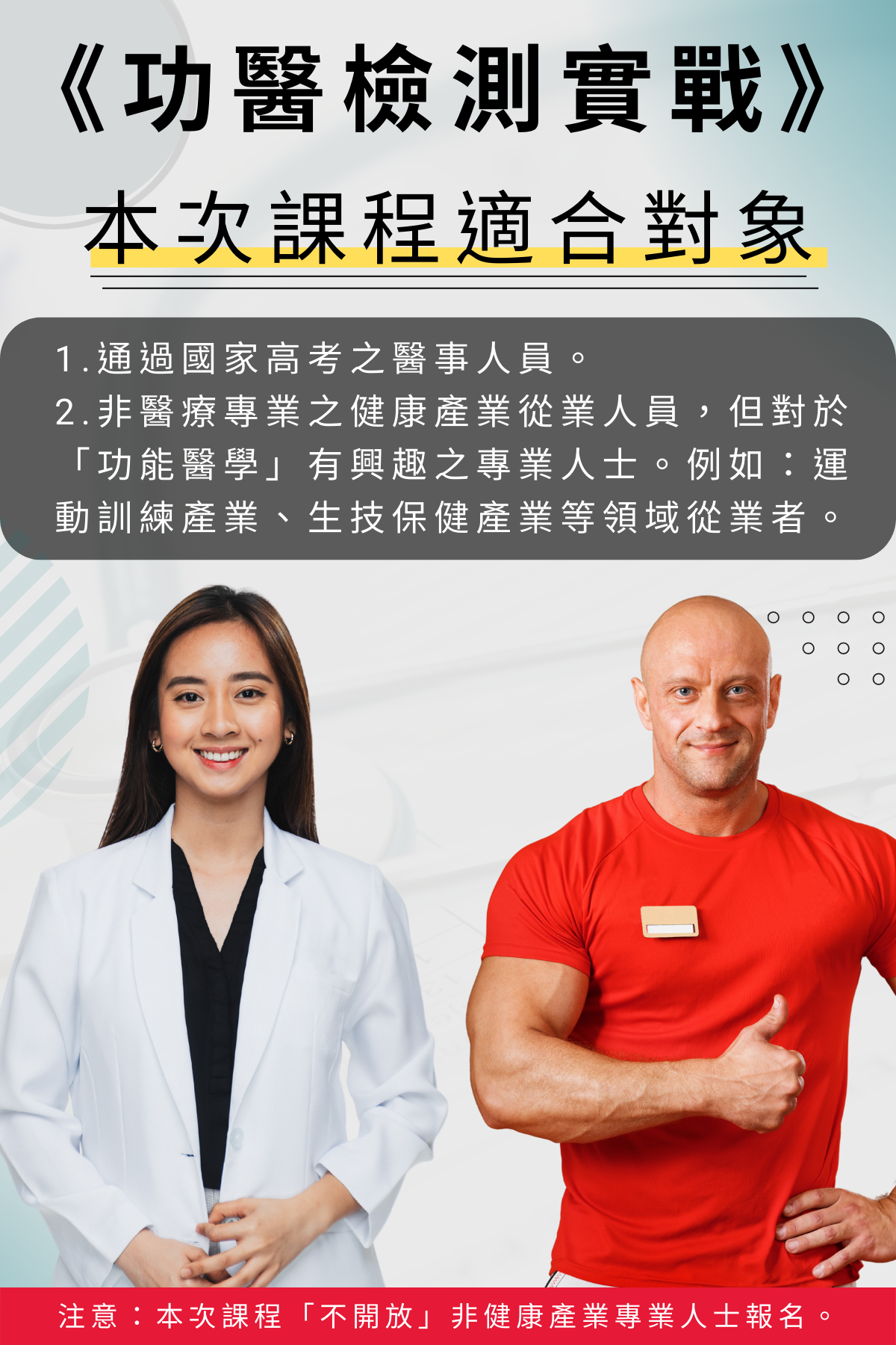 這次課程只要你是【通過國家高考之醫事人員】或是【在健康產業內從業的專業人士】對功能醫學有興趣皆可報名,就不接受非專業人士貨業內從業者報名了!