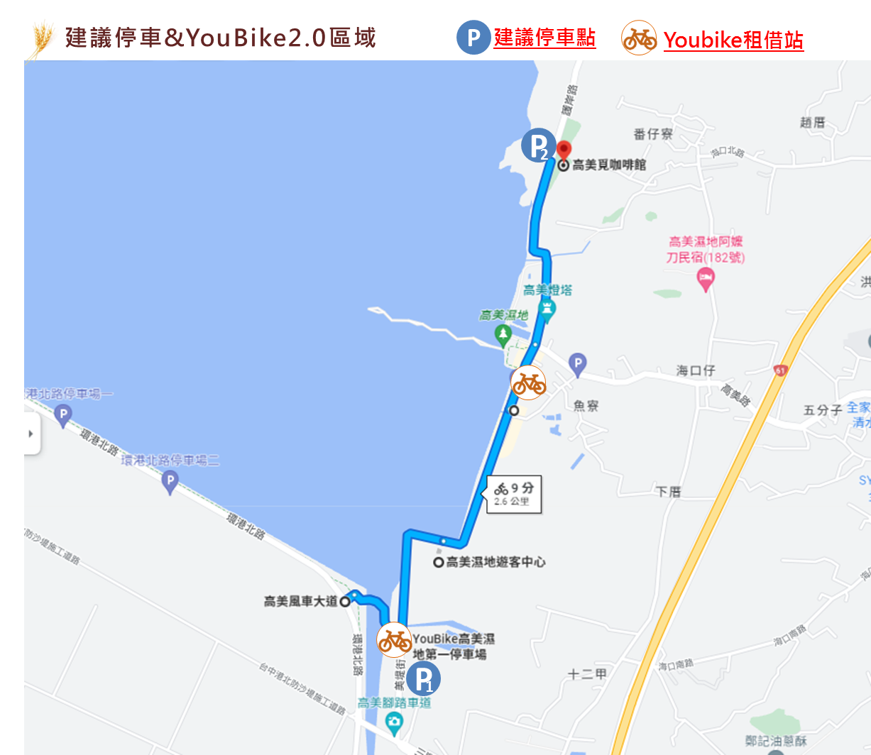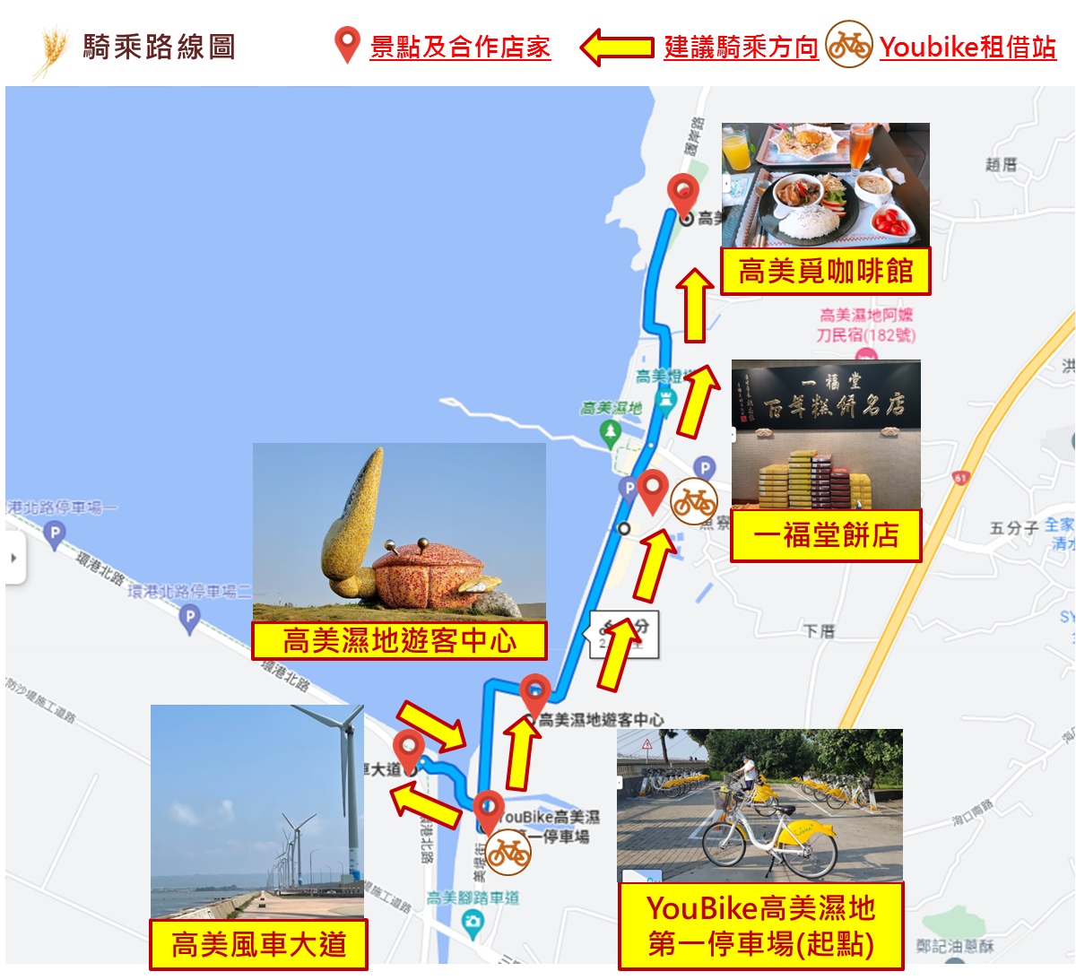 ●俥亭停車場(高美溼地公68停車場)→YouBike高美濕地第一停車場(起點)→高美遊客中心(350m處)→高美風車大道(850m處)→一福堂餅店(1.4m處) →高美覓咖啡館(共約2.4km)