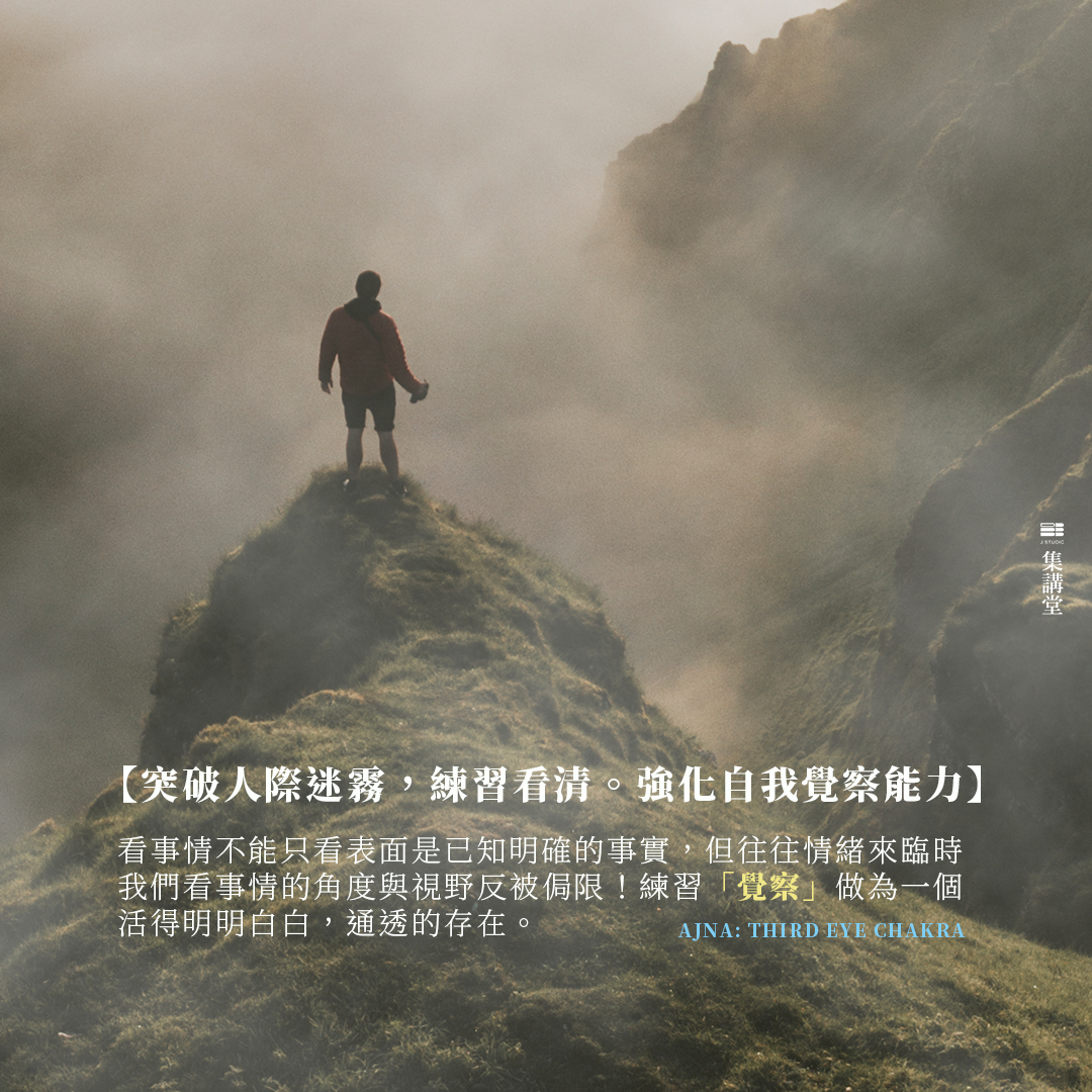 第六輪/眉心輪:透過練習自我覺察(Self-Awareness)能力,褪去情緒,學習看清事情的全貌,提升直覺力,減少人生失誤率